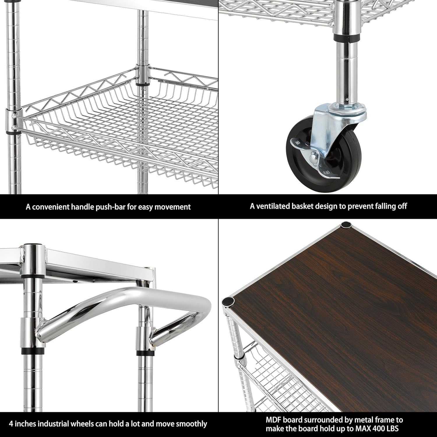 - UPDATE and OPTIMIZE - Wood top carts have more functions with more classic appearance are widely used in daily family life, but load-bearing capacity of the wood top has always been a problem, so we develop a new cart which is used steel frame to reinforced the wooden board and can make the top board loading capacity MAX to 400LBS, balancing aesthetics and load-bearing capacity.