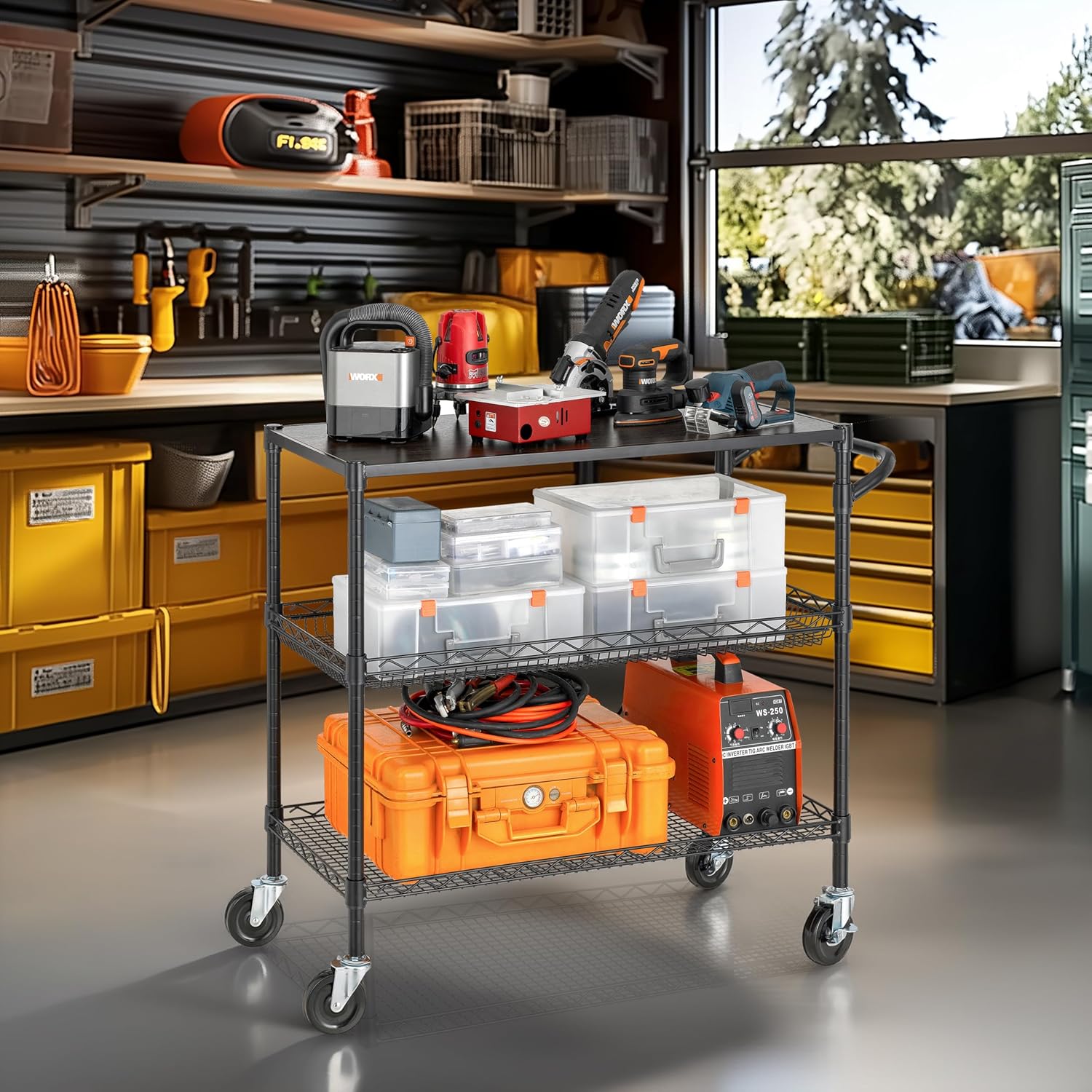 - MUTI-FUNCTIONAL - 3 Shelves unit on 4 inches industrial wheels (2 with brake) to hold and move many small and large appliances. Ideal for using in kitchens, warehouses, garages, offices and restaurants, simplified the transporting of heavy and bulky loads. This mobile cart comes with a convenient handle push-bar and a ventilated basket. The shelves can be adjusted at one-inch intervals.