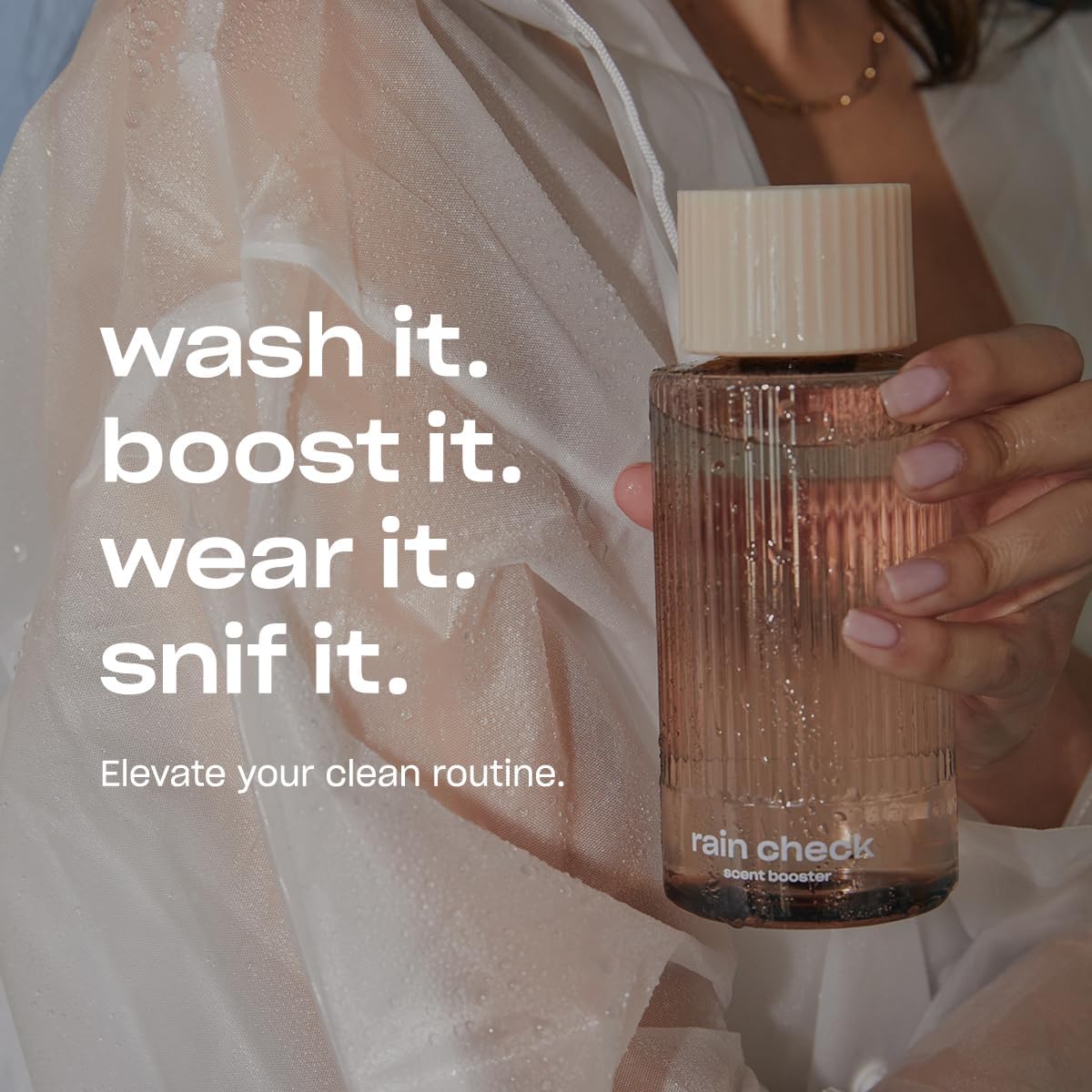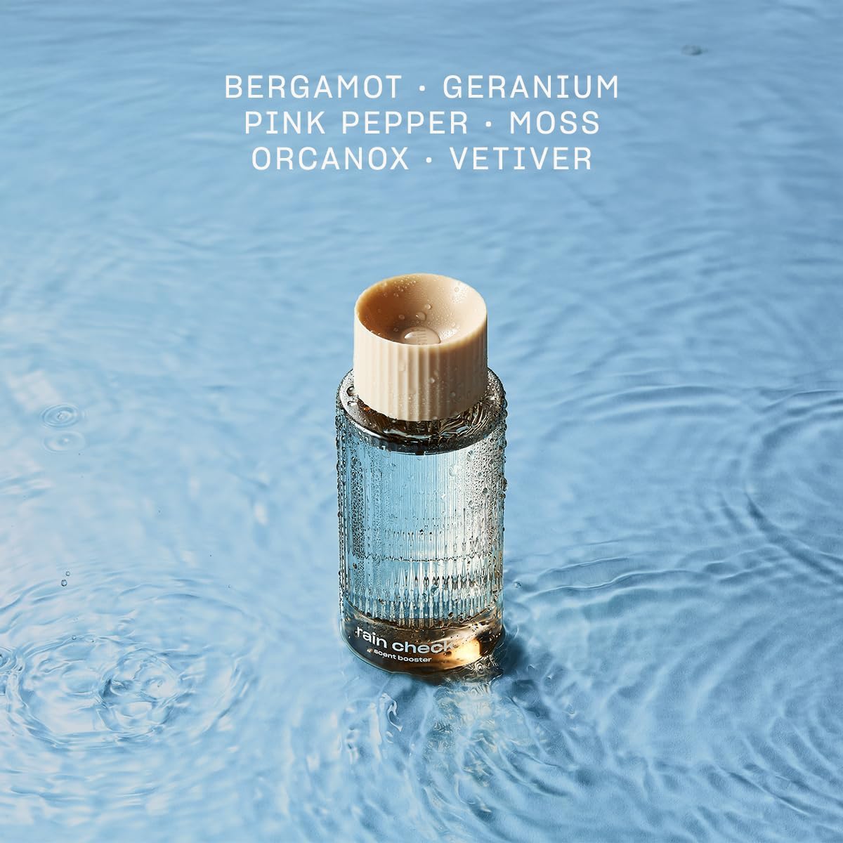- RAIN CHECK: Let the crisp, fresh fragrance of the Rain Check Liquid Scent Booster wash away all your worries. With bergamot, geranium, pink pepper, moss, orcanox and vetiver, this clean combination smells like the silver lining after a rainy day.