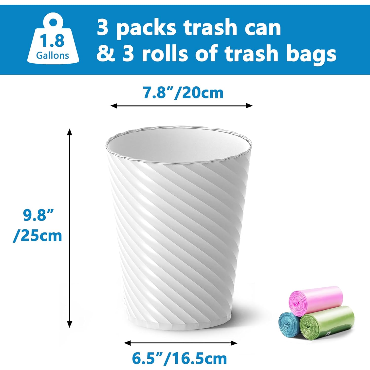 Bathroom Trash Can, 8 Pack 1.8 Gallons Small Trash Can with Trash Bags, Bathroom Garbage Can, Plastic Trash Bin, Round Waste Basket for Bedroom, Office, Kitchen, Room, Compact Space (White)