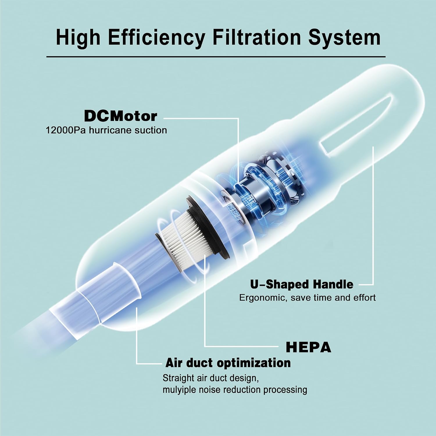- STRONG SUCTION CORDLESS VACUUM CLEANER:The newly designed cordless vacuum cleaner uses a 100W high-power motor,which can provide maximum suction power.The handheld vacuum cleaner has two suction modes that can be freely switched,with a low suction power of 4Kpa and a high suction power of up to 12Kpa