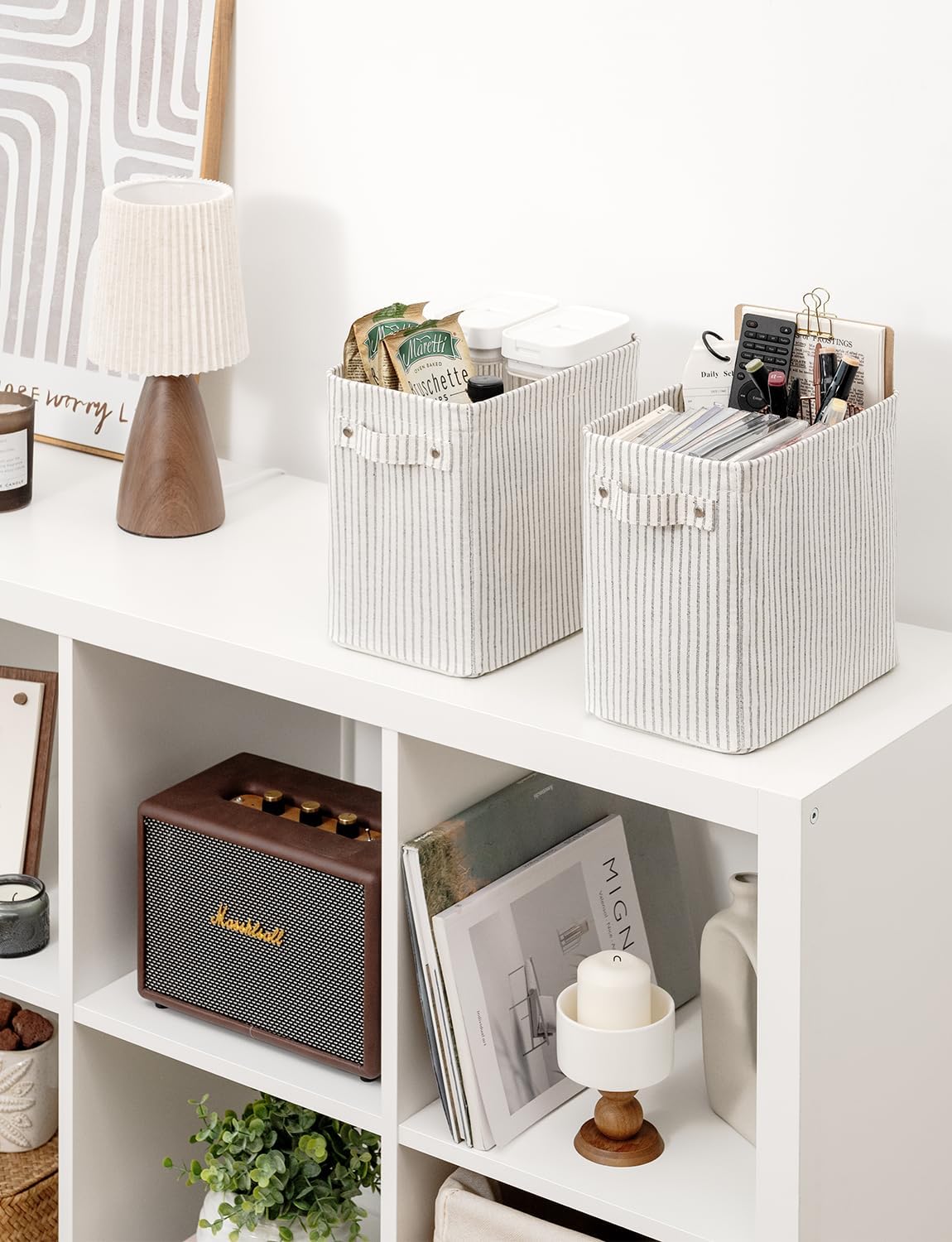 StorageWorks Narrow Storage Bins, Small Basket for Closet and Shelves, Rectangular Fabric Organizer with Handles, Toilet Paper Storage, Khaki and Beige Stripes, 2-Pack