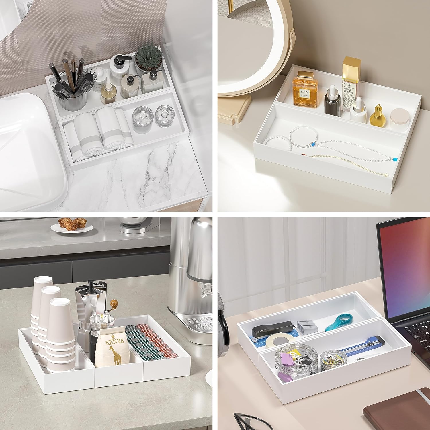- Multi-functional Drawer Organizer Tray - Say goodbye to having multiple messy junk drawers and always having to dig deep for any needed items. Used in kitchen to organize spoons, spatulas, spices, baking utensils and other kitchen gadgets; used as bathroom vanity tray to keep perfume, candle, jewelry, trinket neatly; or used as desk organizers to accommodate your desk supplies, like your pens, post-its, paper clips etc. It will make a great addition in your home or office