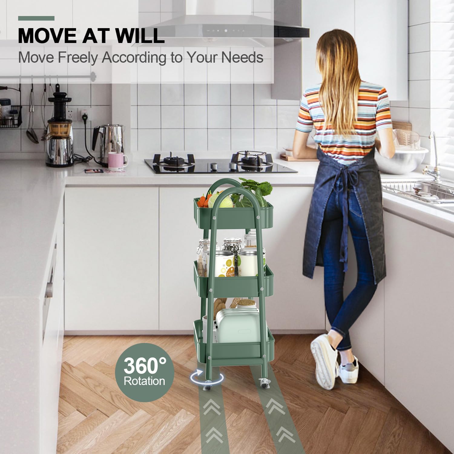 - Move or Lock At Your Will: Our rolling cart is equipped with 4 360° rotating wheels, easy to carry around and change place at will, two of wheels are lockable, provide stability. The modern curved handles design makes it more convenient to push and pull around as needed.
