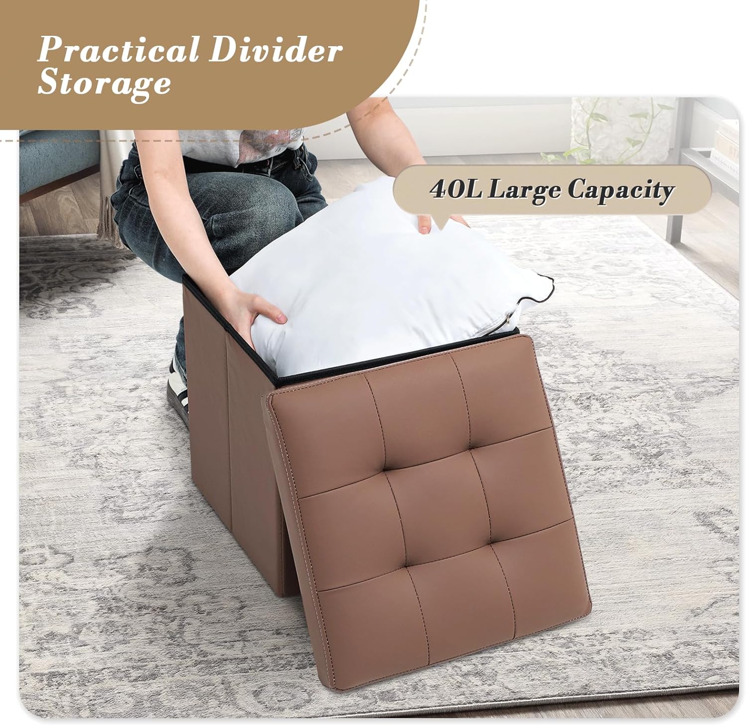 Athena Collection 15" Storage Ottoman Bench Folding Bench with 40L Hidden Storage, Small Cube Ottoman PU Leather Foot Rest Stool Chest with Flipping Lid for Living Room, Bedroom, Entryway, Brown
