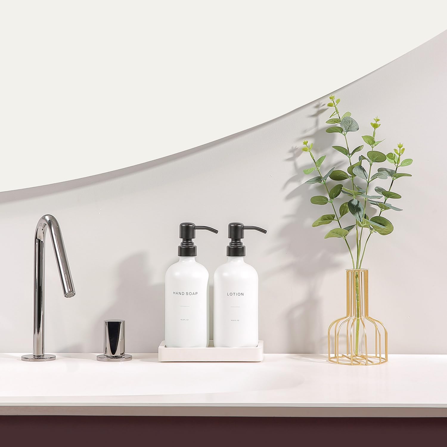 - [Thoughtful Tray] Soap and lotion dispenser set with tray adds an extra touch of style and convenience. The tray is designed with anti-slip pads, providing stability and preventing the bathroom dispenser sets from sliding.