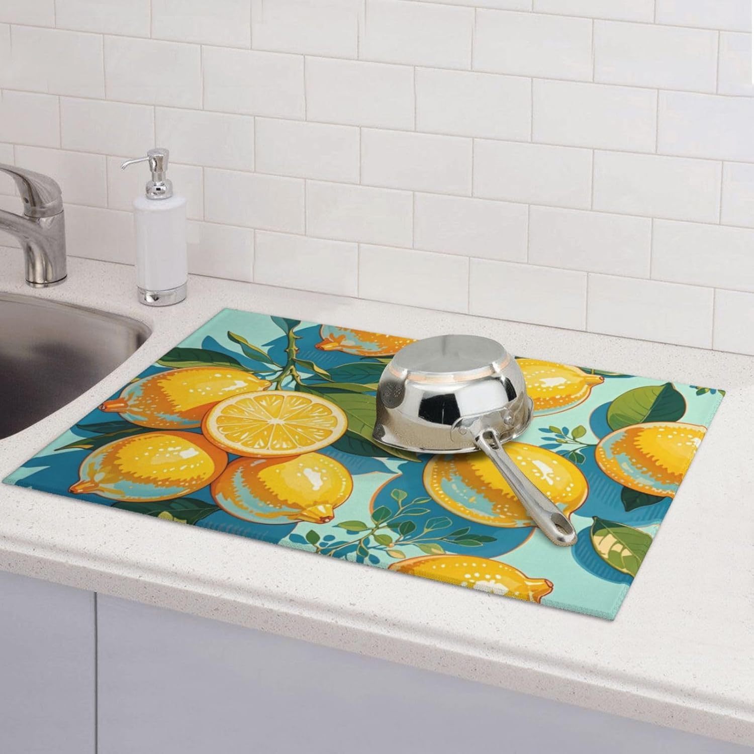 lemon Dish Drying Mat Highly Absorbent Double-Sided Microfiber with Hanging Loop Reversible Drain Dish Rack Mat Drain Mat Suitable for Kitchen Countertop Coffee Bar 18 x 24 Inch