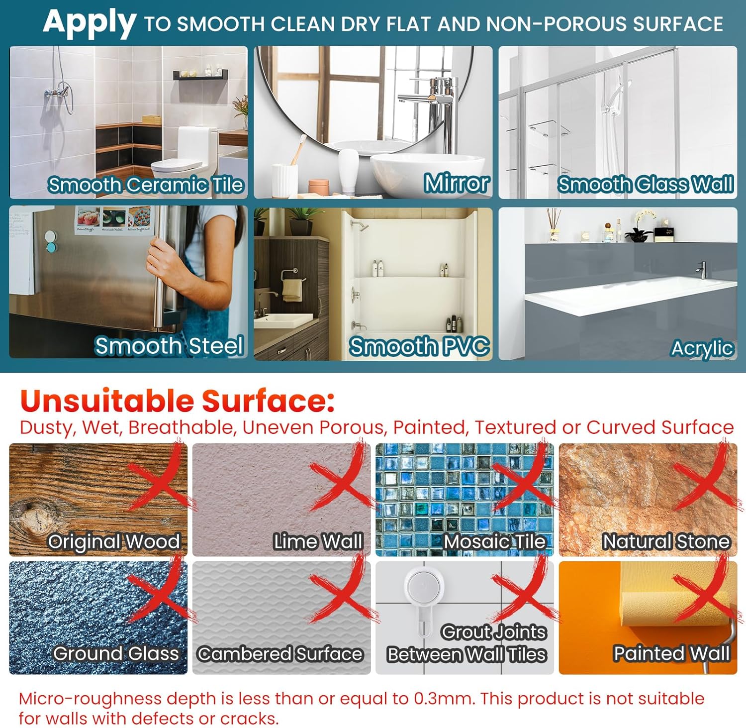 - EASY INSTALLATION: Simply press down the suction pad to squeeze the air out, they will stick to the wall firmly. You can finish the installation in 1 second. No screws, nails, glue or tools required for installation. (Please clean the wall and keep it dry, pay attention to avoid installing at the tiles with gaps to ensure vacuum suction)