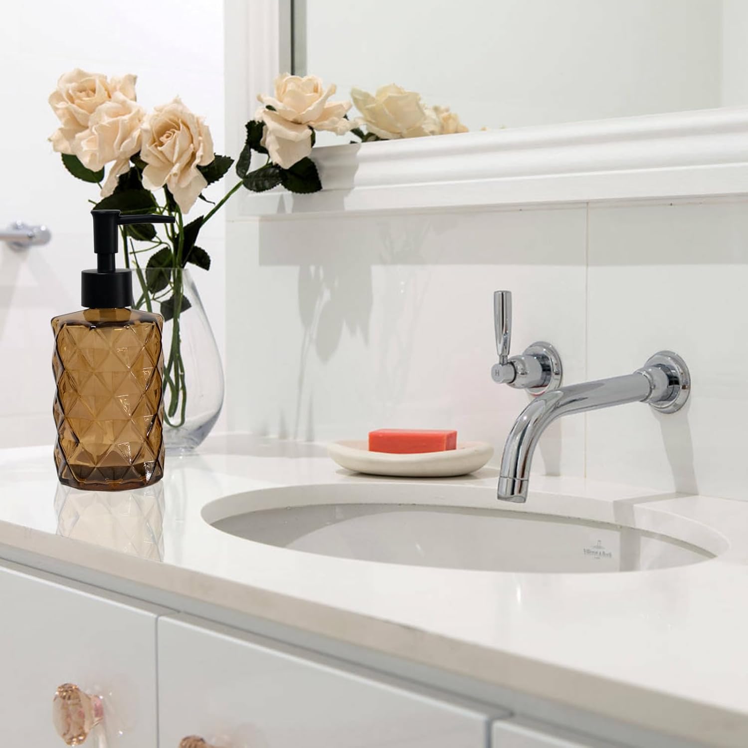 Brown Bathroom Soap Dispenser with Black Plastic Pump, 12oz Glass Lotion Dispenser, Crystal Hand Soap Dispenser for Modern Home Decor, Kitchen Countertop, Hotel