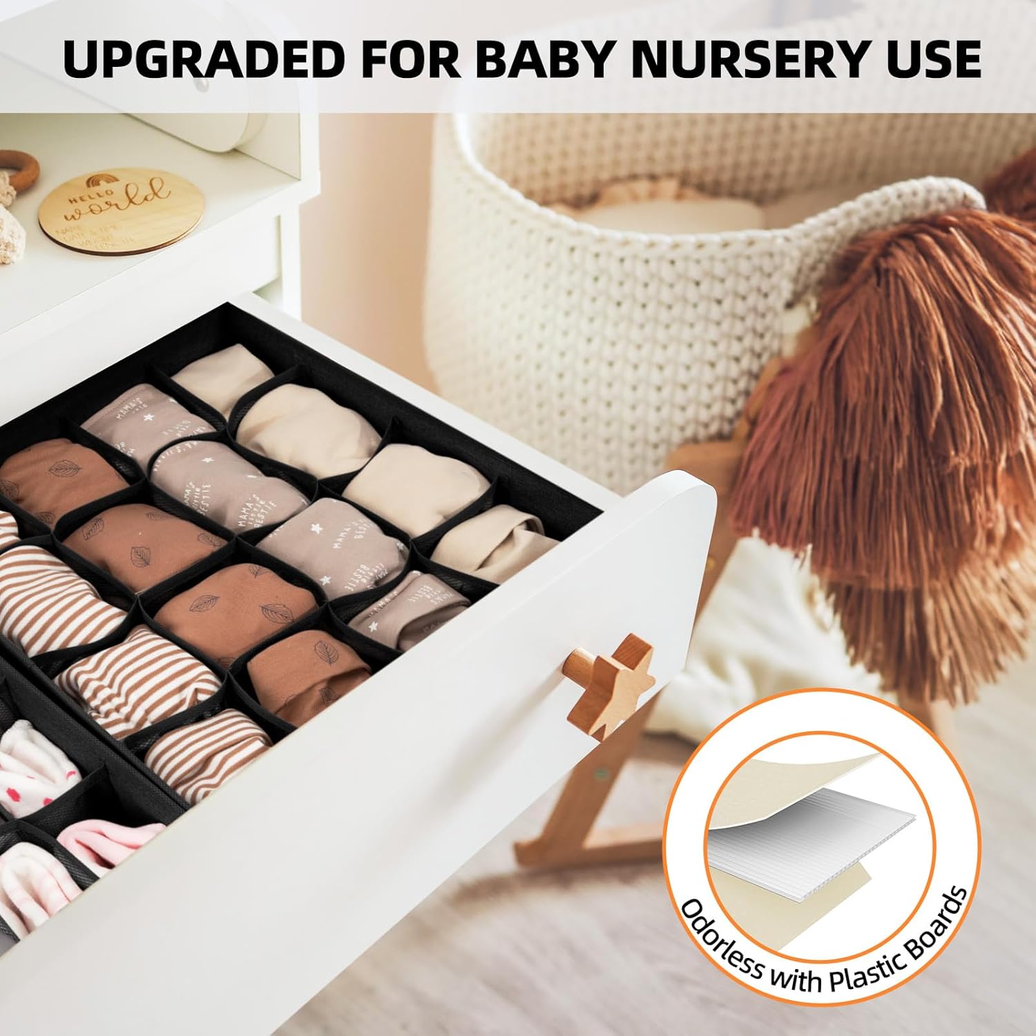 - 【SOLVE YOUR QUALITY CONCERNS】Maybe you noticed a strange smell in your drawers? Many organizer bins are made of cardboard, causing odors. Our Criusia drawer organizers use durable plastic boards wrapped in cationic cloth, making them 10 times more durable than non-woven fabric. They are odorless, ideal for baby nursery organization, and washable for a longer lifespan.