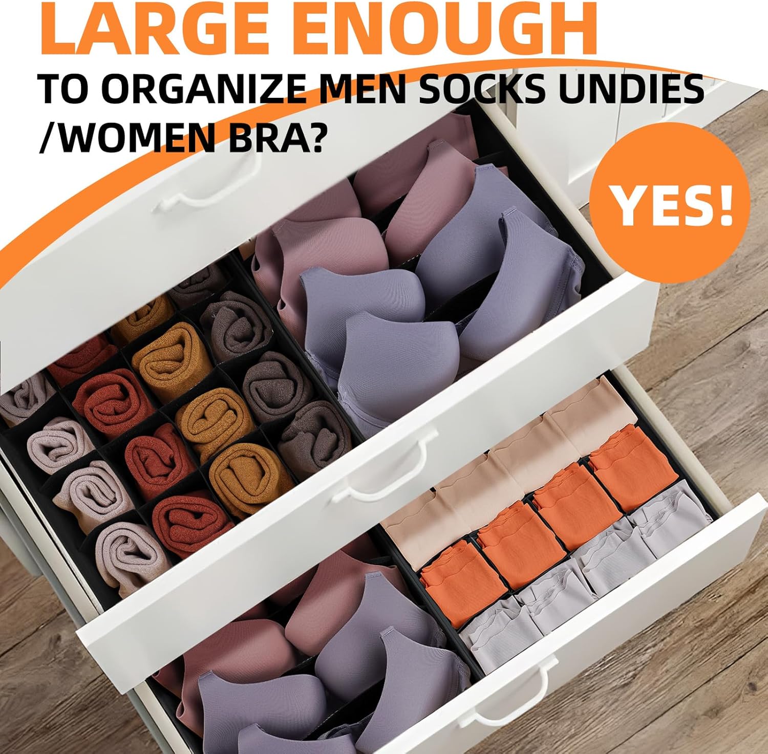 - 【90 LARGE COMPARTMENTS】Unlike other sock organizers with small sections, our clothes organizer features slightly larger compartments in 3 sizes to better accommodate various under-clothes storage and space saving needs. It's perfect for men’s boxers, winter socks, women’s bras up to C cup, yoga leggings, hair accessories, ties, scarves, belts, yarns and even small Christmas ornaments.