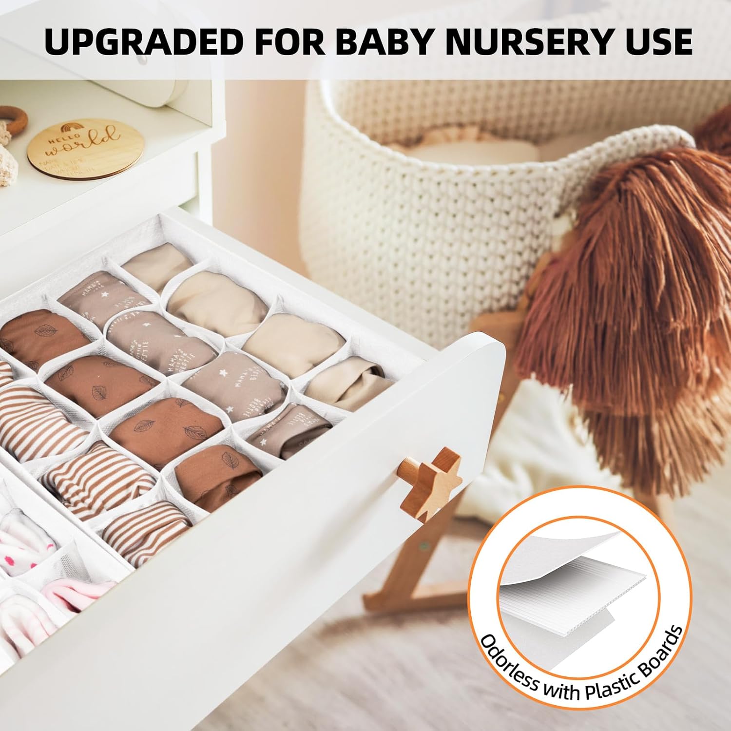 - 【SOLVE YOUR QUALITY CONCERNS】Maybe you noticed a strange smell in your drawers? Many organizer bins are made of cardboard, causing odors. Our Criusia drawer organizers use durable plastic boards wrapped in cationic cloth, making them 10 times more durable than non-woven fabric. They are odorless, ideal for baby nursery organization, and washable for a longer lifespan.