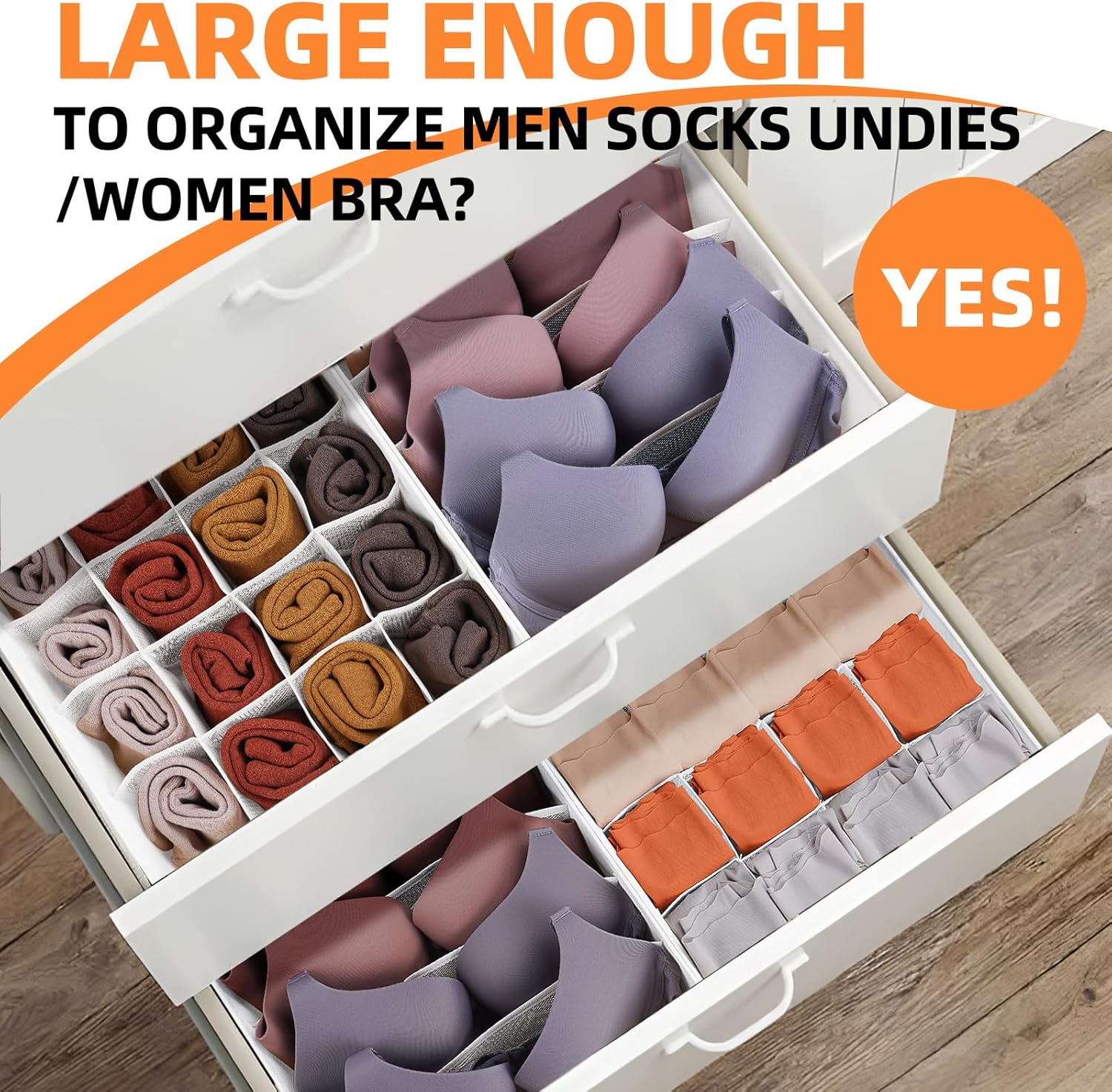 - 【90 LARGE COMPARTMENTS】Unlike other sock organizers with small sections, our clothes organizer features slightly larger compartments in 3 sizes to better accommodate various under-clothes storage and space saving needs. It's perfect for men’s boxers, winter socks, women’s bras up to C cup, yoga leggings, hair accessories, ties, scarves, belts, yarns and even small Christmas ornaments.