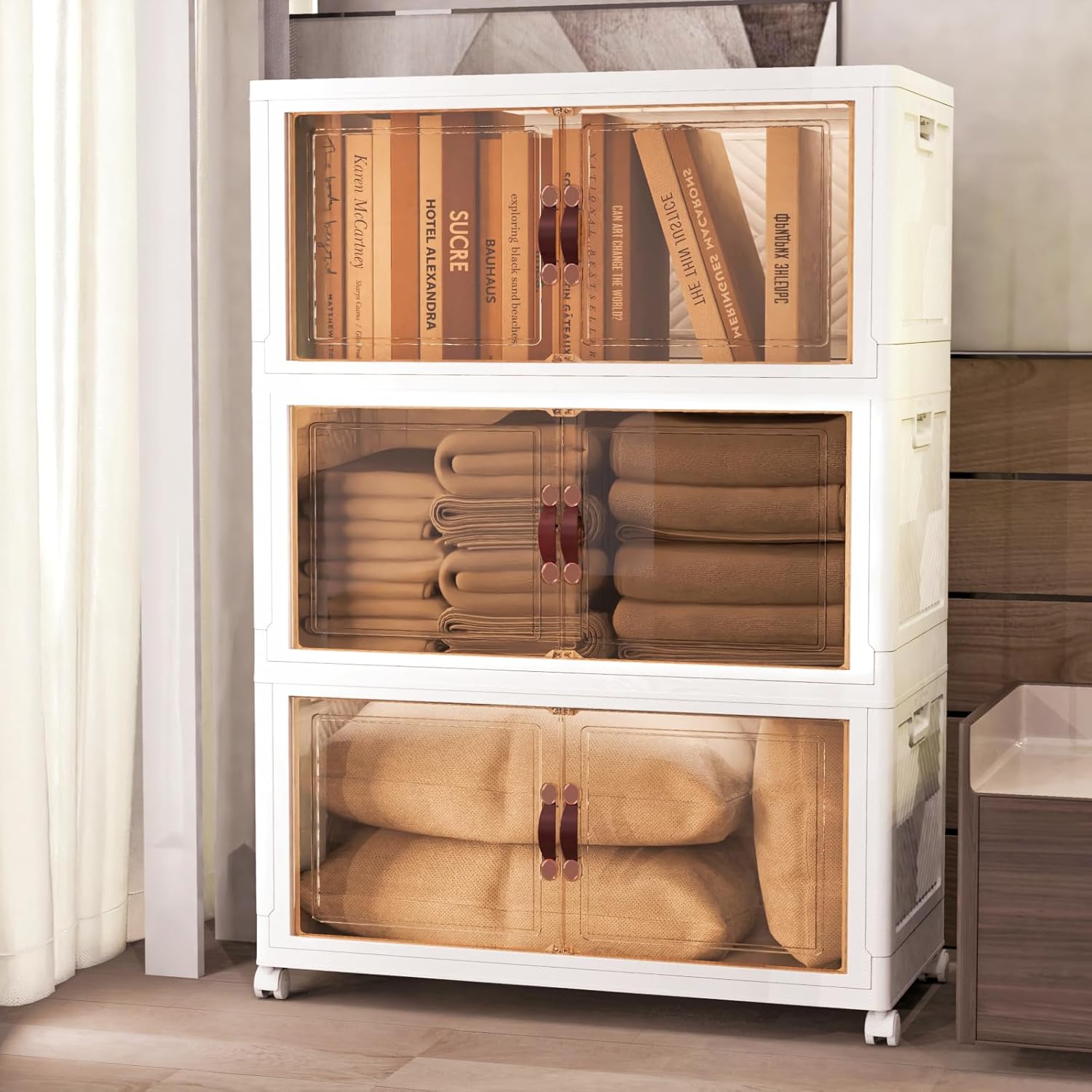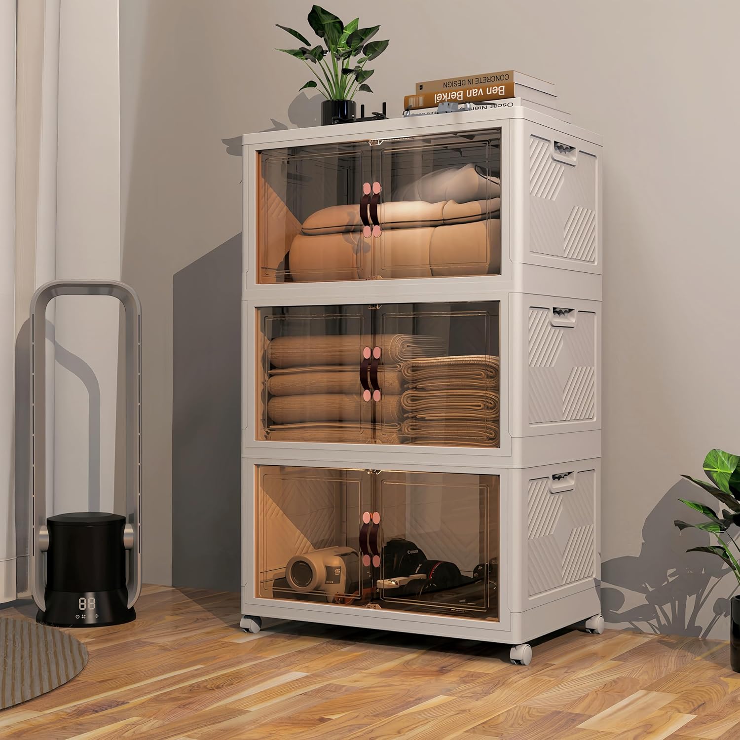 Tansheep Stackable Storage Bins with Lids, Collapsible Plastic Bins for Closets, 78 Quart Organizers with Doors and Wheels, Thicken and Large Cabinet for Home Bedroom(57 Gal, 3Pack)