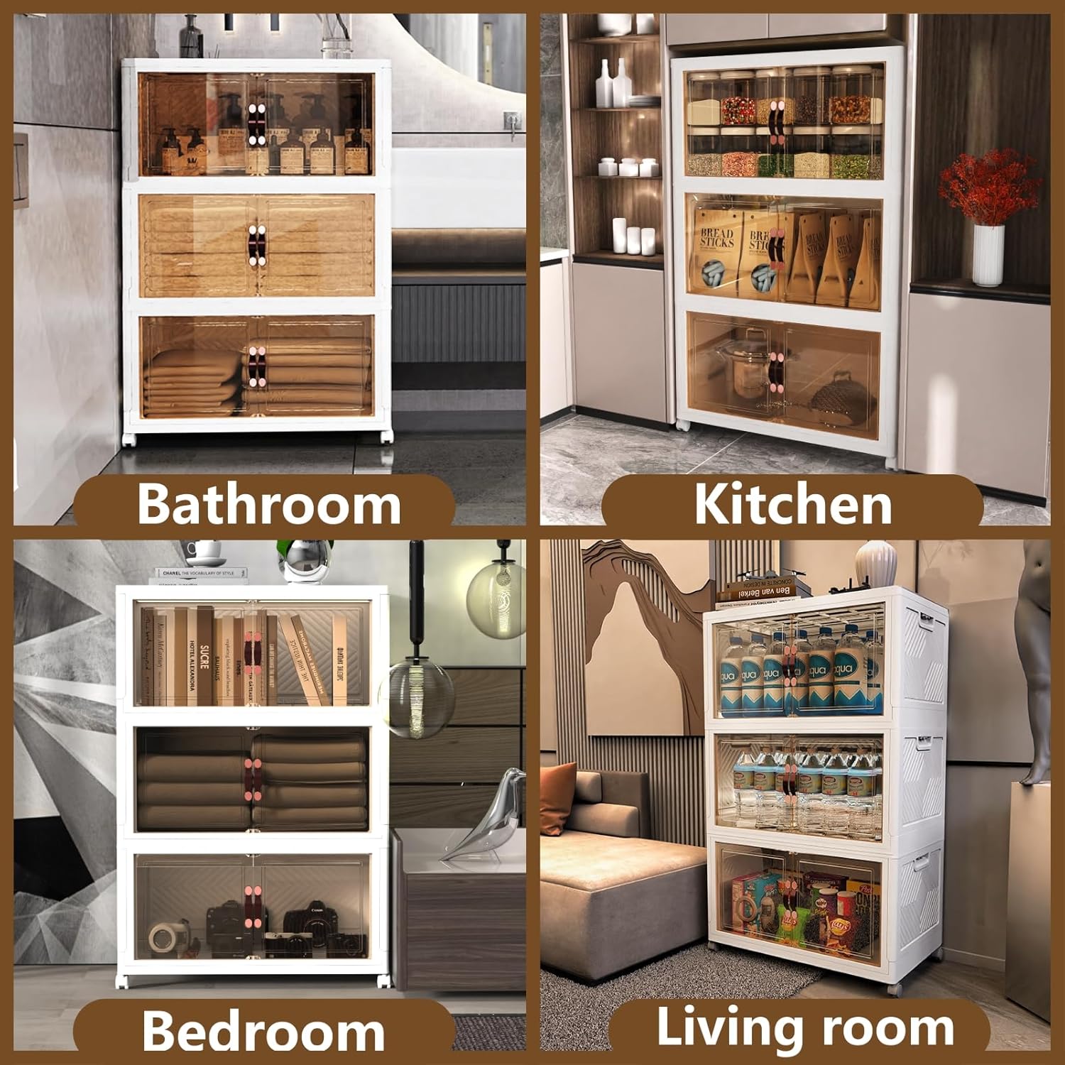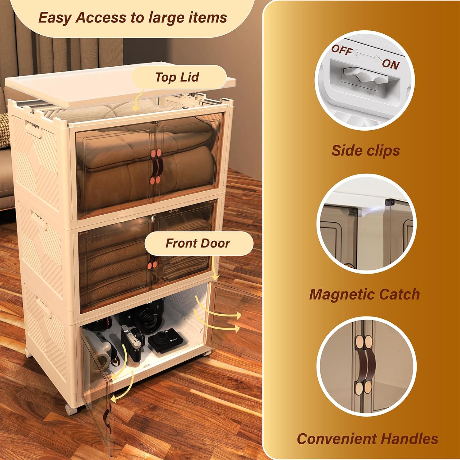 - Double door and Visual Design: This storage bins with lid can be opened from the front doors and the top lid,and the 2 opening ways are convenient to access to stuffs from different directions.The top lid is easy to quick access to large items,such as clothes and blankets.Powerful magnets are built into the front door, so you don't have to worry about the door opening on its own.The door uses a coffee color transparent material, so that the clear storage bins can be visualized, so that you can quickly find the items you need, saving your time.