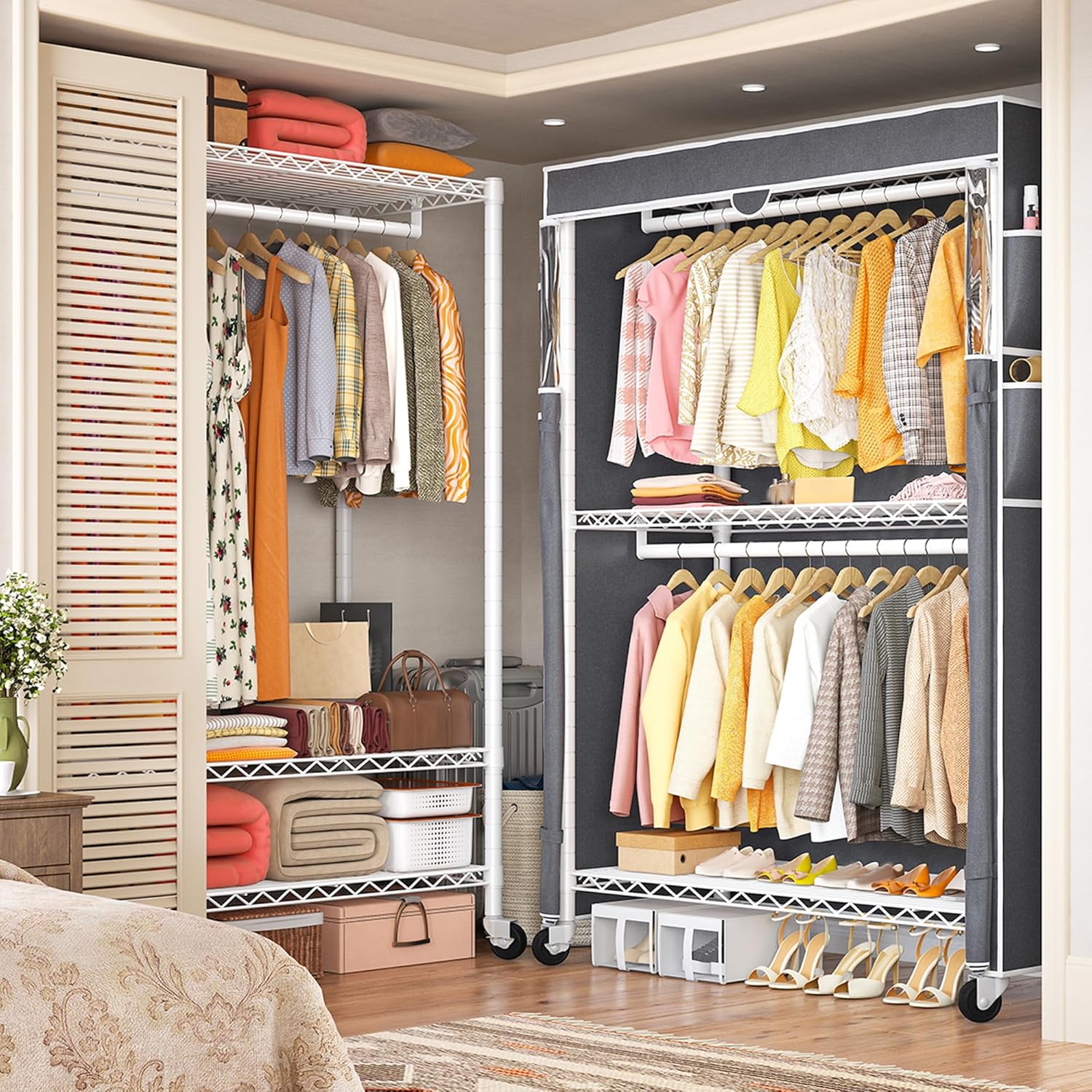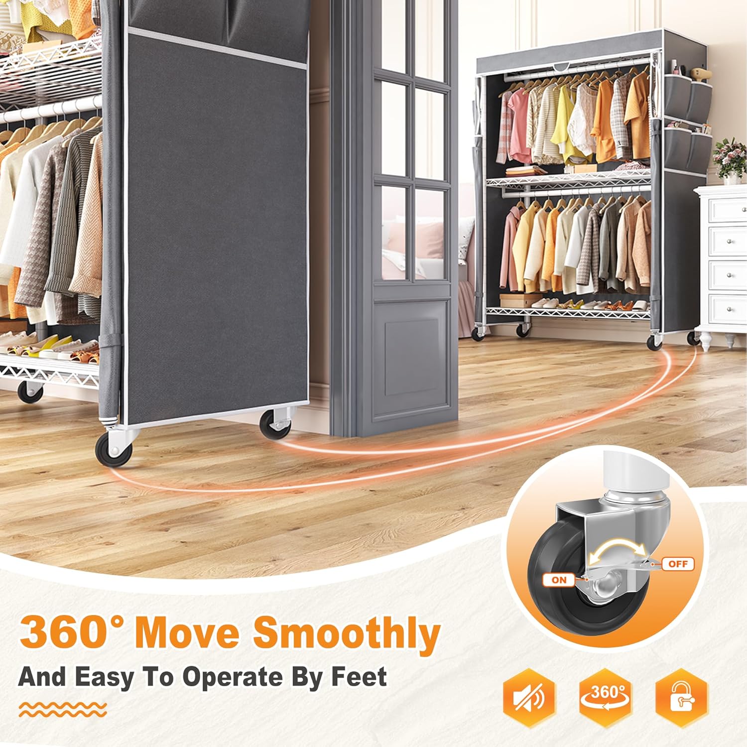- 【Quality Clothing Rack can be Used in Multiple Situation】: The clothes racks are equipped with a window dust cover and two options for supporting feet. When moving this garment rack, you can choose 360° rotating wheels, designed to allow you to roll this garment rack anywhere you need in your home, and two of the wheels are lockable, so you don't have to worry about the clothes rack will run on its own. You can also use adjustable feet to support the clothes rack to meet your various use needs.Stay organized and efficient—great for school, dorm, or home workspace