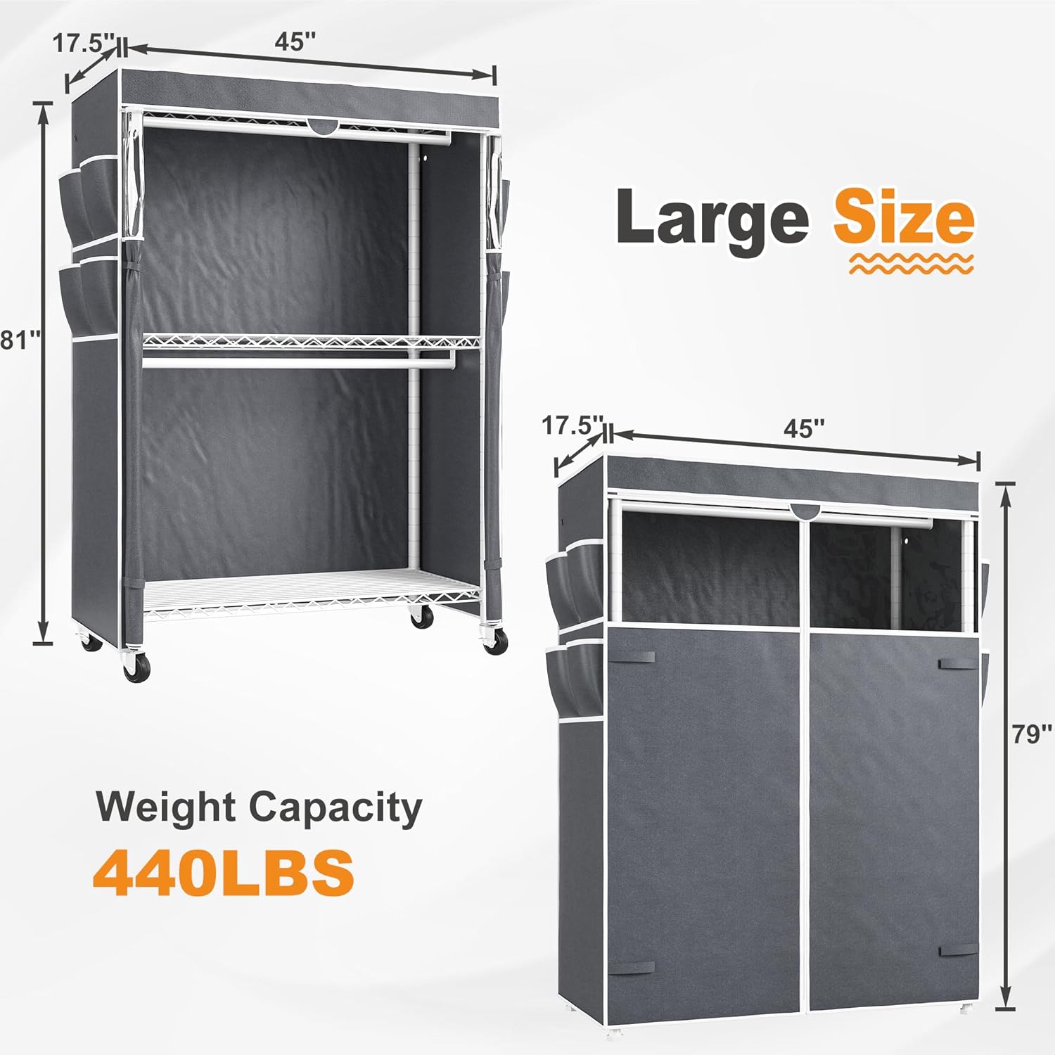 - 【Clothes Rack with Cover 440LBS Bearing Capacity】The clothing rack has 3 shelves and 2 hanging rods, which can hang about 150+ T-shirts clothes or 80+ winter clothes. Single hanging rod can support up to 44 LBS. Raybee heavy duty clothes rack suits different place: bedroom, cloakroom, laundry room, corners. The max load capacity of this clothes rack is 440lbs when stationary, and 176lbs when rolling