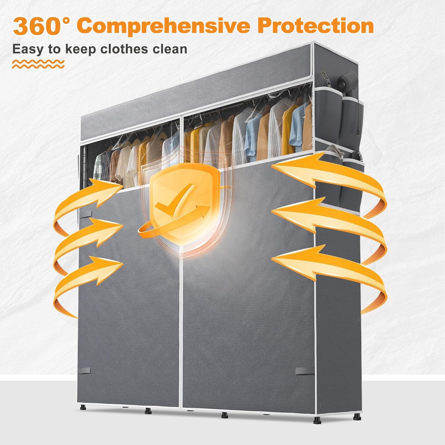 - 【Garment Rack Cover with Triple High-Quality Zippers】The clothes rack cover adopts a new three-way zipper design, allowing the front cover to be opened leftwards, rightwards, or completely opened, making it easy to retrieve and place items inside the clothes rack. After fully opening, use the fixed straps latch on the side of the frame to keep it in the open position. The clear and visible window design makes it easy for you to take out clothes. And you can zip your clothes rack cover closed to keep your private space if you have visiting guests.