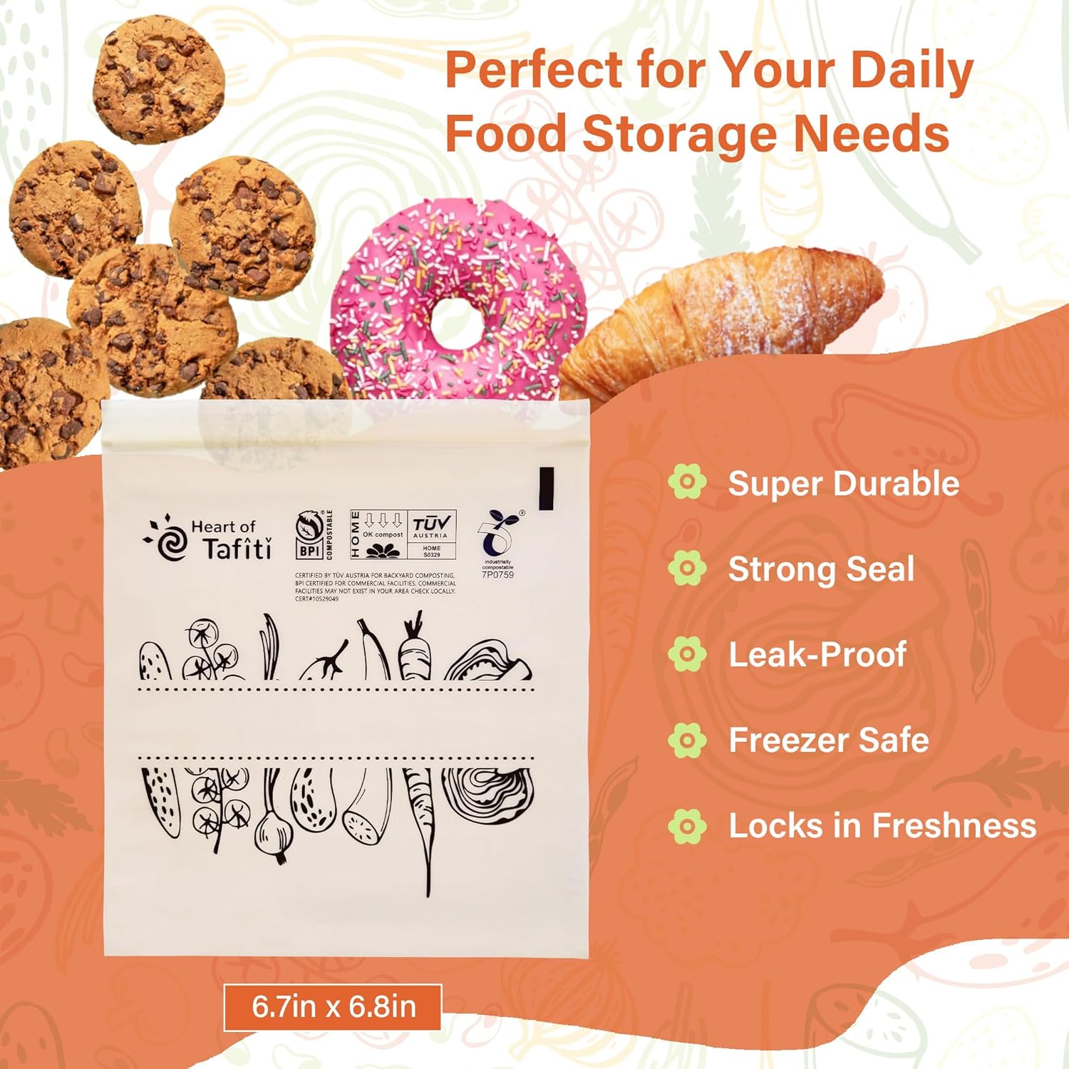 - Certified Compostable in U.S. & Europe: Heart of Tafiti resealable food storage bags are certified compostable, meeting the highest-rated standards, including ASTM D6400, European EN 13432, and BPI certification, ensuring they decompose in industrial composting facilities.