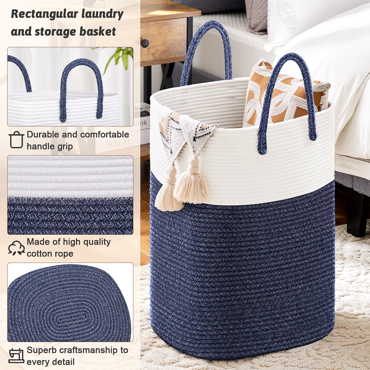 Laundry Basket,Woven Cotton Rope Laundry Hamper,Versatile Storage for Dirty Clothes,Baby Toys,and Blankets in Bathroom, Nursery,and Living Room (Blue, 40L)
