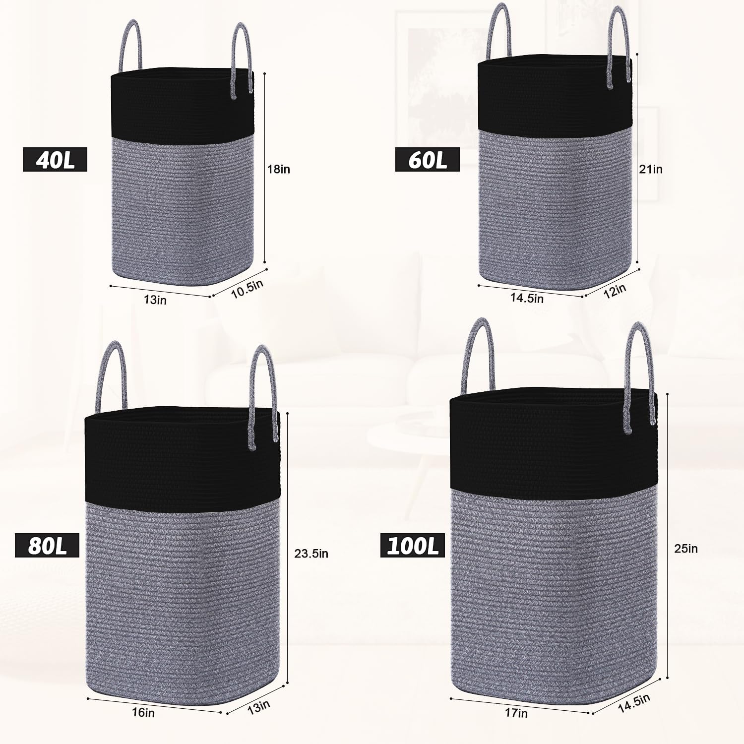 Laundry Basket,Woven Cotton Rope Laundry Hamper,Versatile Storage for Dirty Clothes,Baby Toys,and Blankets in Bathroom, Nursery,and Living Room (Black, 100L)