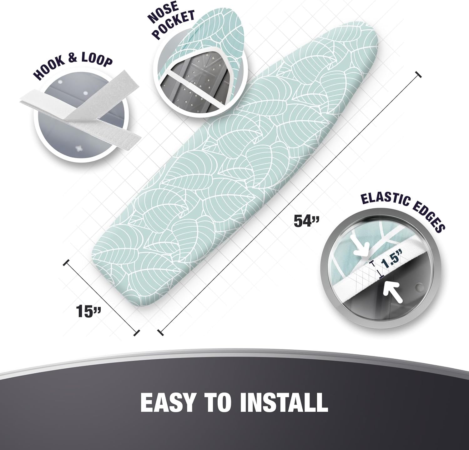 - EASILY FITS STANDARD 15x54 SIZE BOARDS: The ironing board cover can be installed very easily thanks to its durable elastic edges or adjustable drawstring tightening, strong fastener straps and sturdy nose pocket. It is designed for standart size boards in 15x54" dimensions.