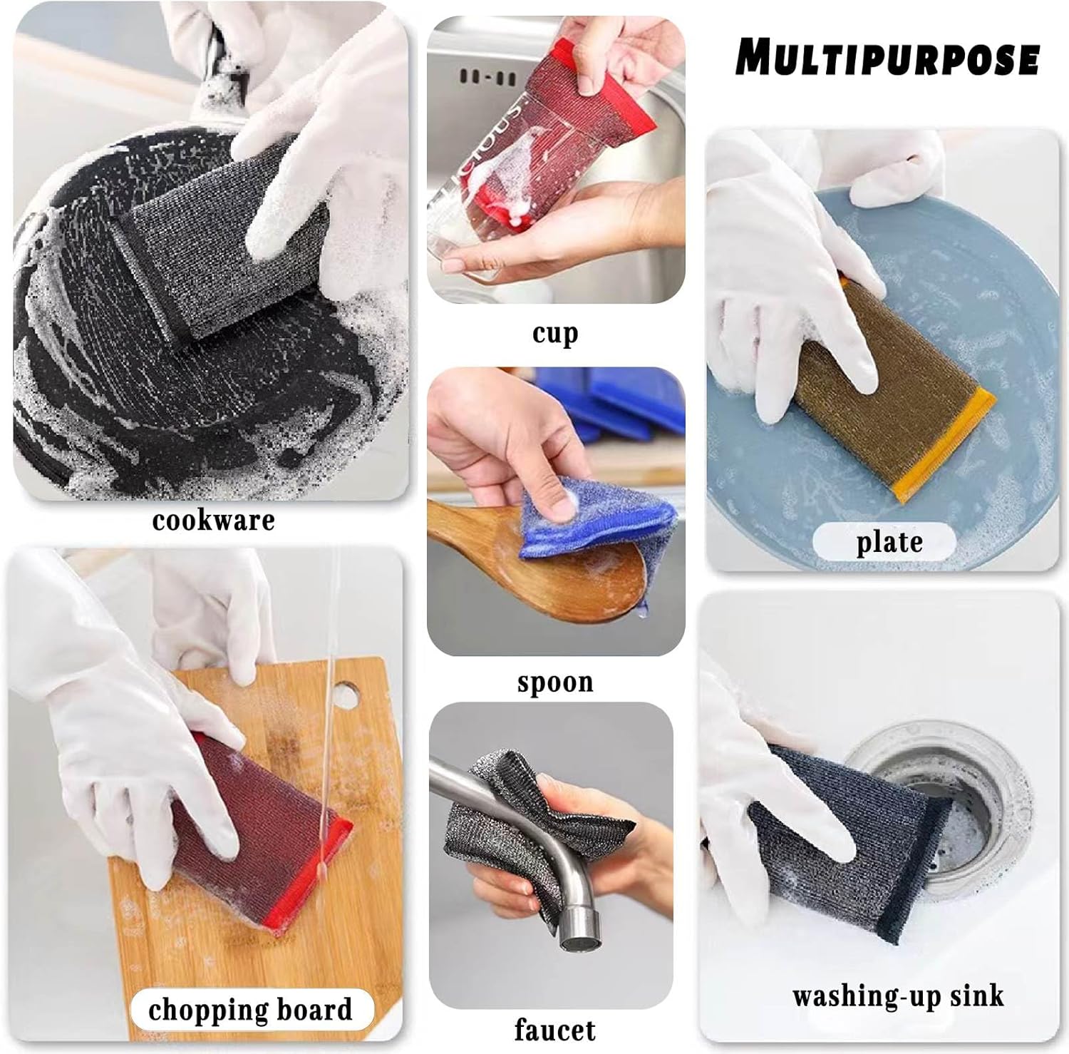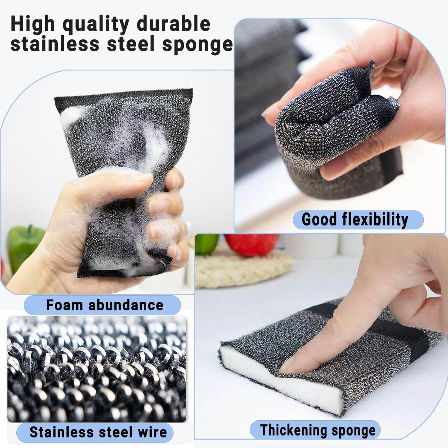 - Steel wool scrubber: Our kitchen scrubbers sponges are made of high-quality stainless steel wire and thick sponges, which enriches the foam and provides a powerful scrub, it does not leave a scratch on the surface.