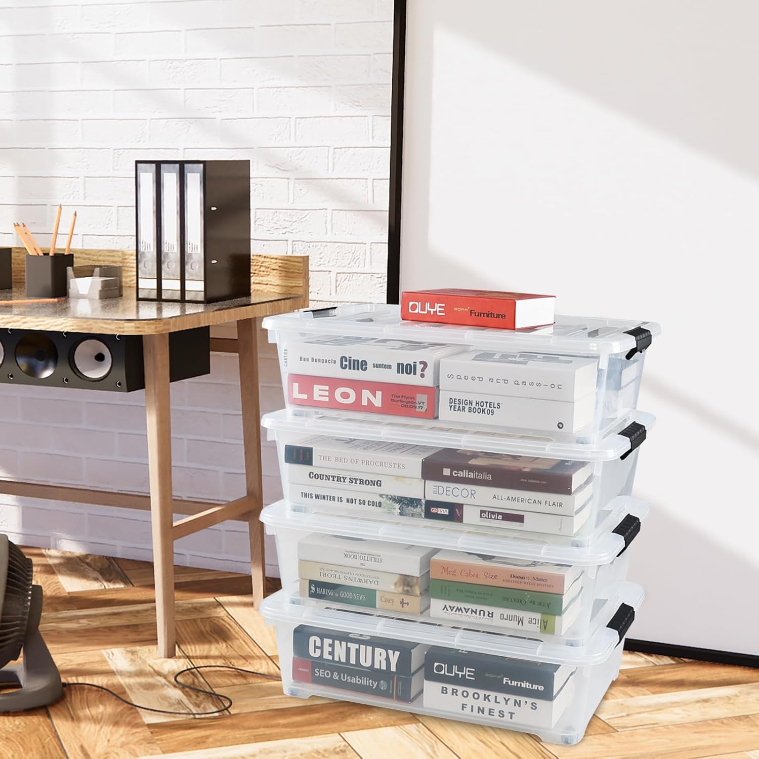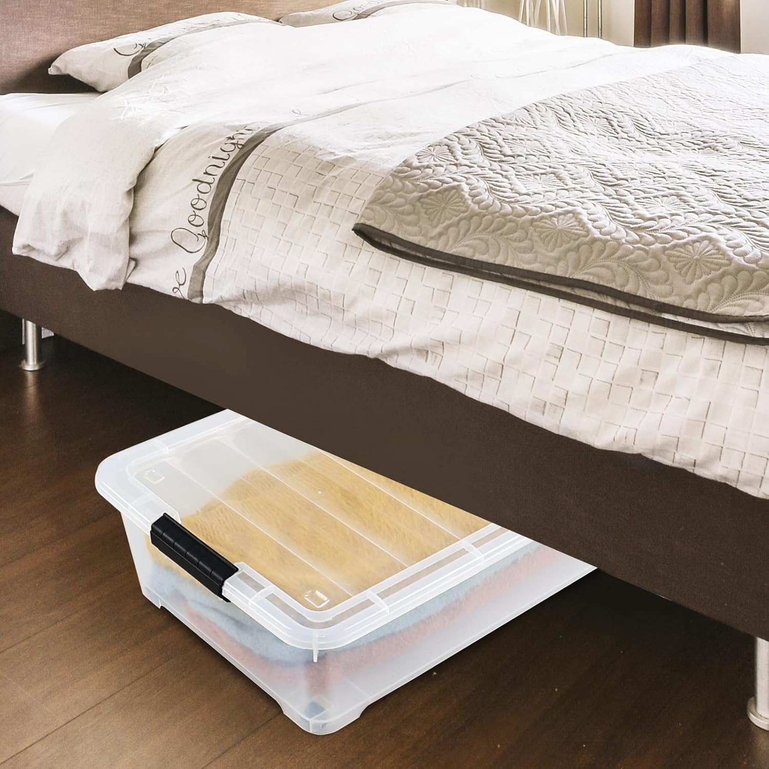 25 L Plastic Sturdy Rolling Under Bed Storage Container Bins, Clear Underbed Storage with Latching Lid and Wheels, 4 Packs