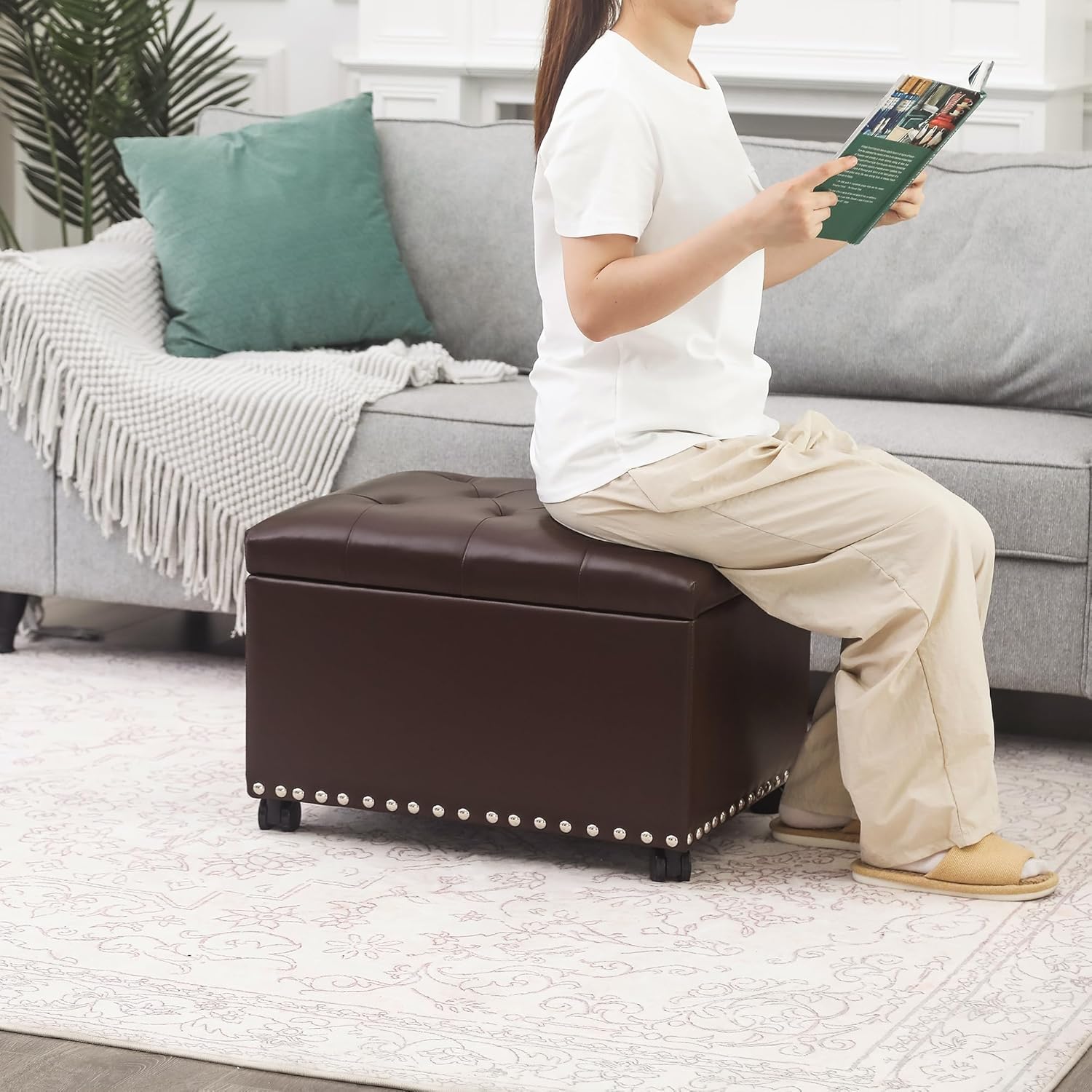 Joveco Leather Storage Ottoman with 360° Caster Wheels 24" Foot Rest Bench Rectangle Ottomans Stool for Living Room Bedroom (Brown, Wheels)