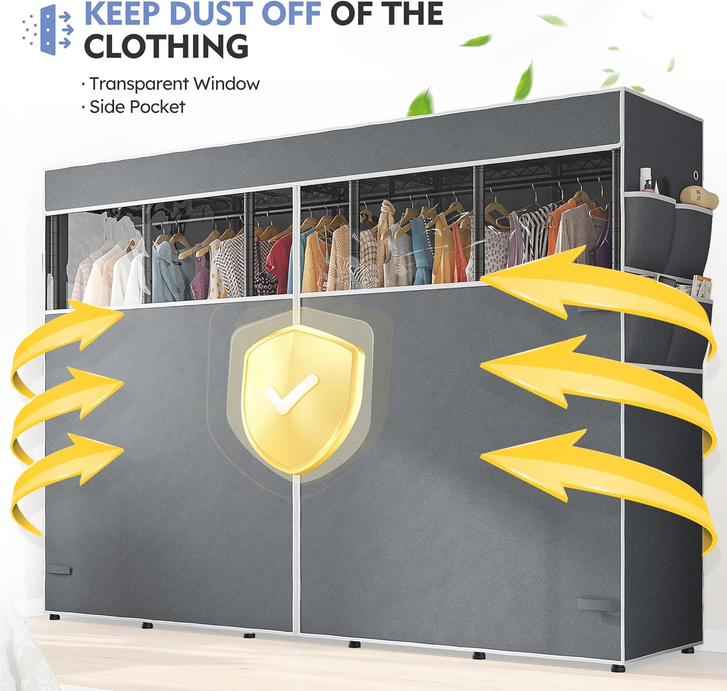 - 【Spacious Wardrobe Compartments】Clothing rack with 5 hanging rods perfect for hanging tops, coats, and sweaters. 8 storage shelves perfect for storage of items such as handbags, hats, quilt and storage box. Wardrobe can hold suitcases and large storage bins at the top, and shoes at the bottom. It adds more storage space for all clothes and accessories and makes home neatly organized