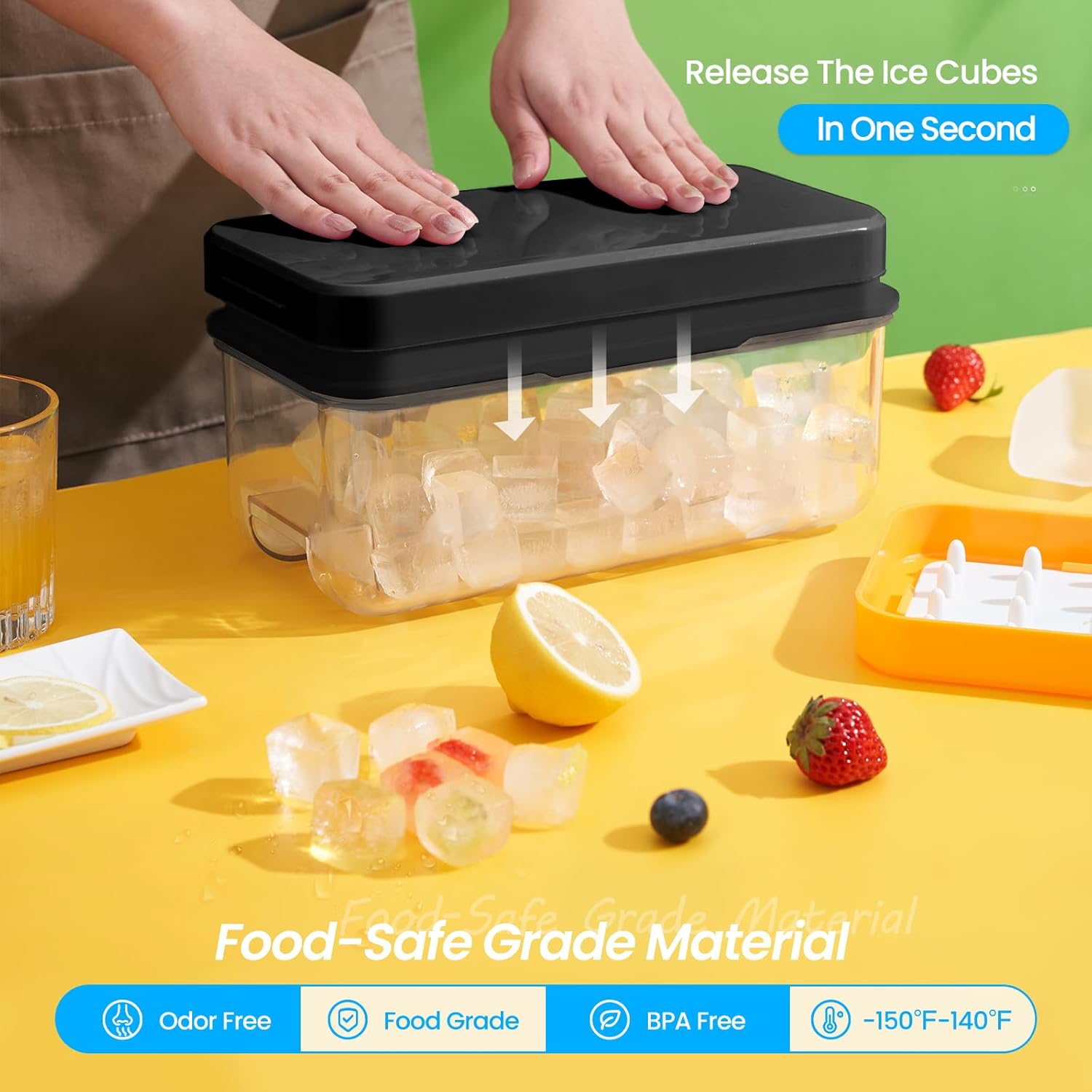 - Easy to Release:This ice cube tray uses a push type to quickly release ice cubes. Simply place the ice tray upside down on the ice bin, close the lid and press the middle of the lid with both hands to unmold easily. Do not overfill with water. Twisting the tray, or waiting a few minutes at room temperature is more conducive to releasing the ice.Our products are protected by patents under US D1,006,068 S & US D971,684 S