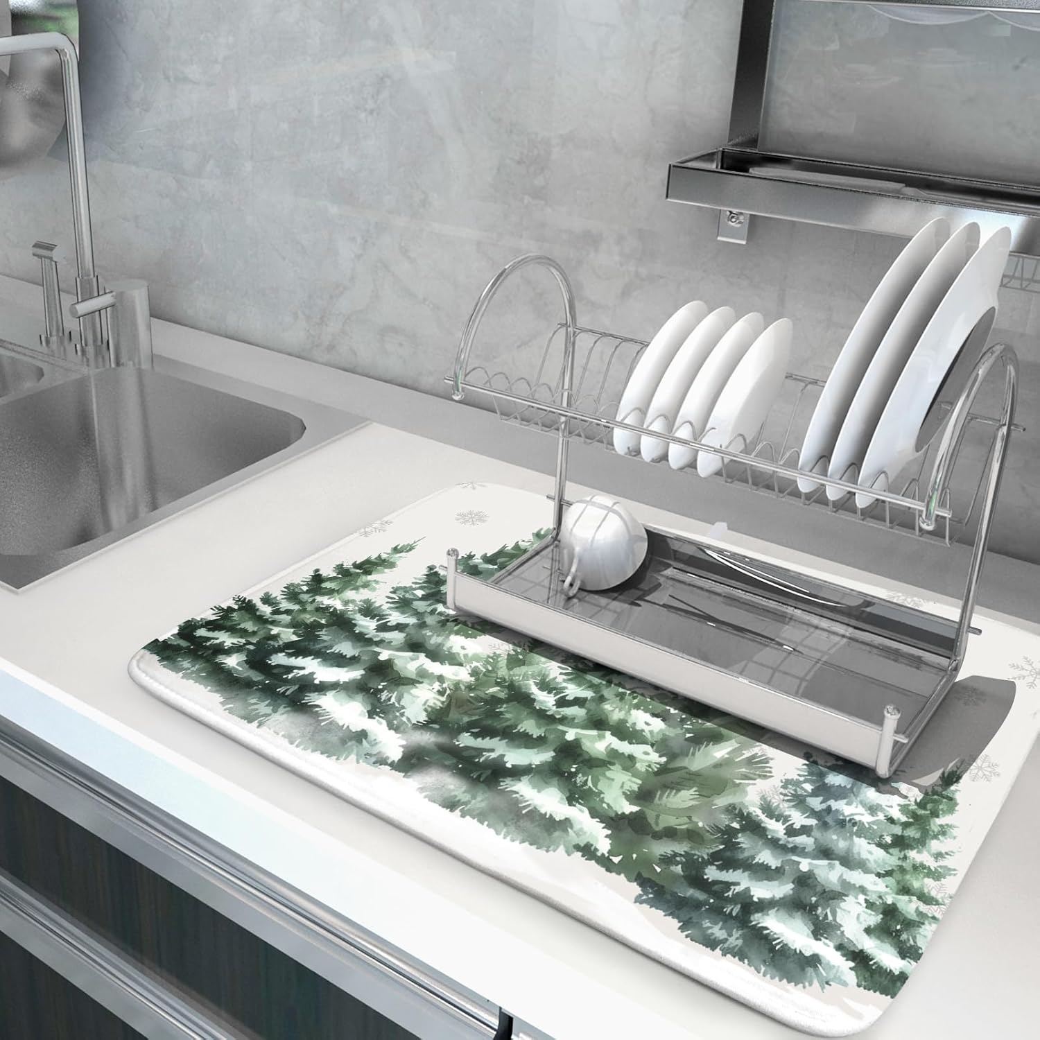 - 【Dish drying mat】The winter pine tree dish drying mat is 16x18inch/18x24inch, which is suitable for most homes and kitchen countertops while providing a smart and sharp look. Our dish drying mat is soft and durable, can be used as a drying mat, put down all sizes of kitchen tableware, also can be used as a protective pad, dish mat, cup mat, heat insulation pad for countertop for heat insulation and ironing, which can perfect hold your dishes, plates, big pots and pans.