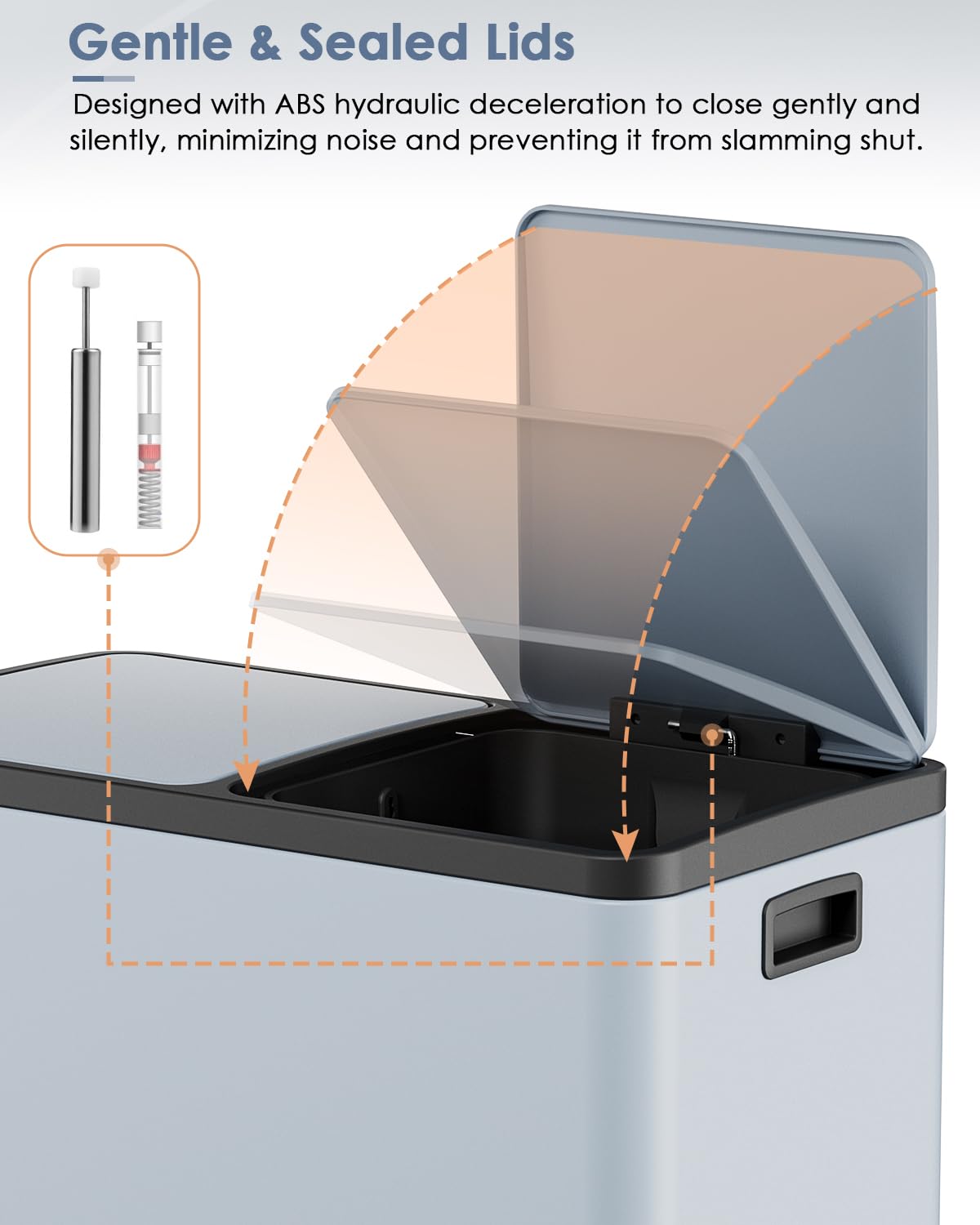 - GENTLE CLOSE: Lid of the trash can is designed with ABS deceleration, which effectively reduces the closing noise and does not make a popping sound, putting the trash can in the bedroom is also a good choice.