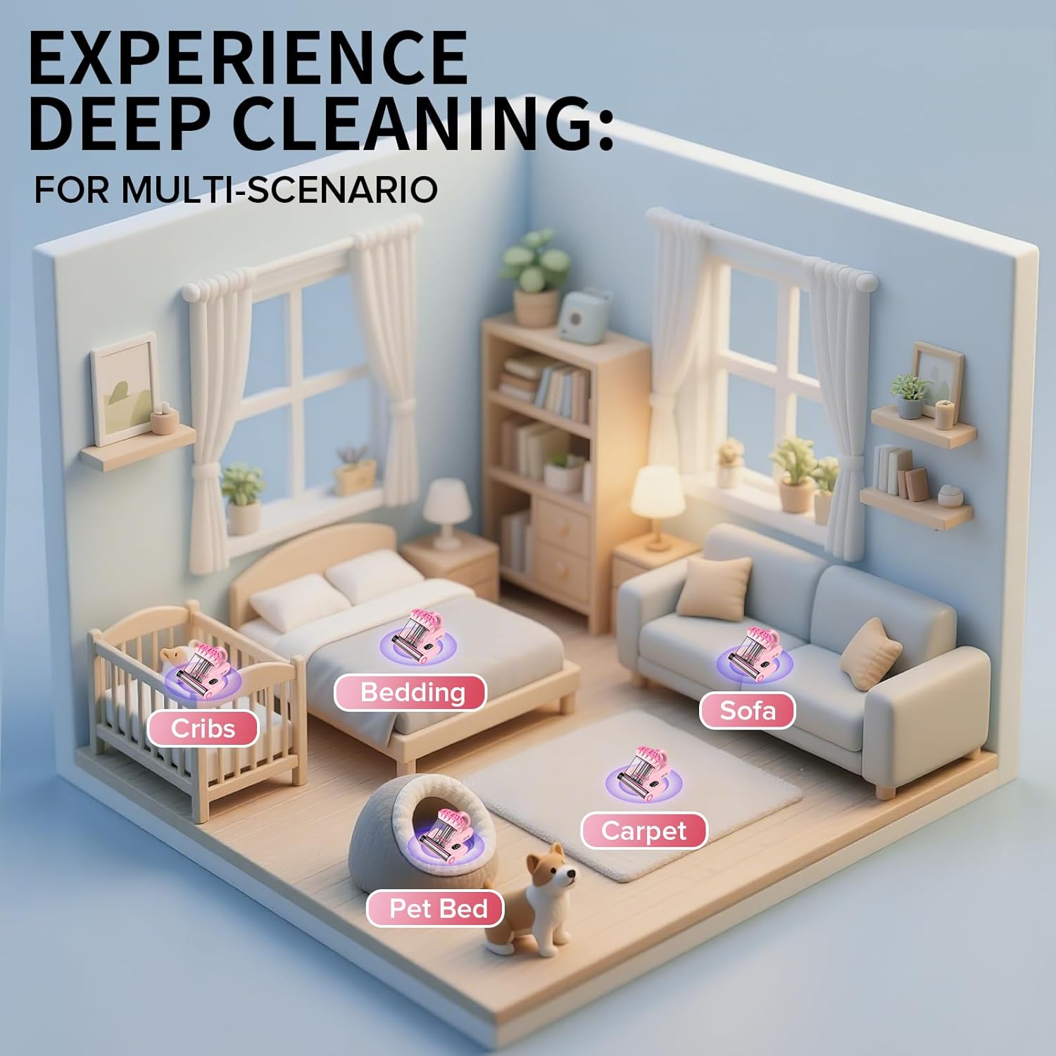 - 3-IN-1 Cleaning: With 253.7nm UV lights, 140°F (60℃) hot air and a high-frequency rotating brush, our vacuum cleaner removes 99.99% of hidden risks from mattress, sofa, baby crib, pet bed, and carpet, etc. Ideal for households with pets and babies. Note: The UV only operates when the machine is in direct contact with the mattress; lifting the machine automatically stops the UV function