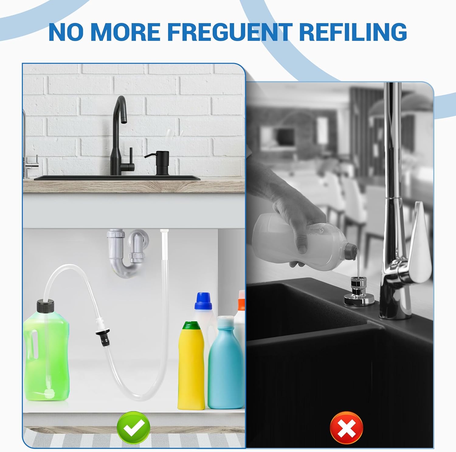 - SAY GOODBYE TO FREQUENT REFILLS: With the 47" kitchen sink soap dispenser extension tube kit, use the big bottle directly, no more refilling the tiny dish bottle.