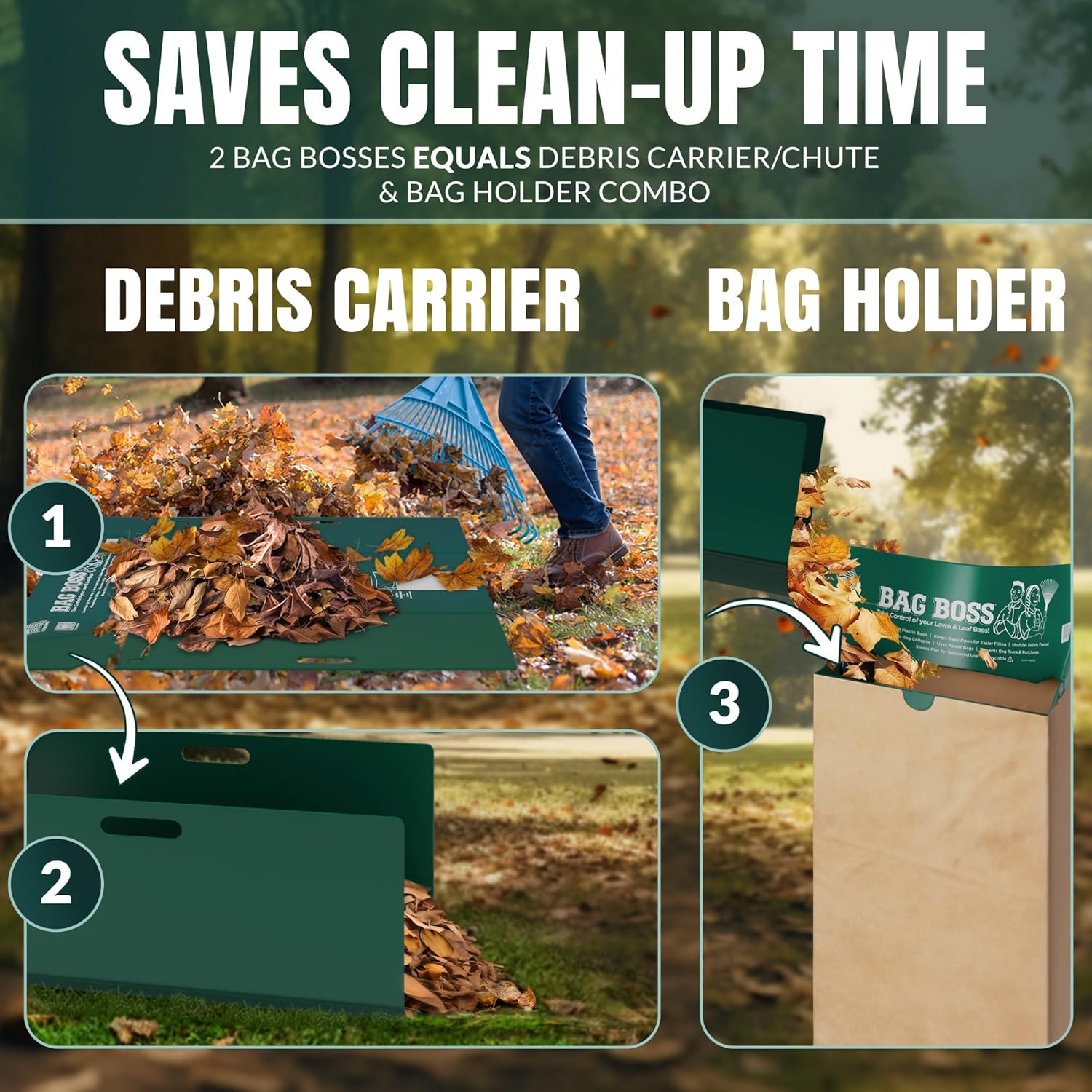 - DOUBLES AS A DEBRIS CARRIER - Beyond being a lawn and leaf bag holder, the patented Bag Boss transforms into a convenient super-sized debris carrier with integrated and ergonomic handles, to simplify debris collection. Use the Bag Boss to easily transfer collected debris into another Bag Boss held bag for a highly efficient cleanup process.