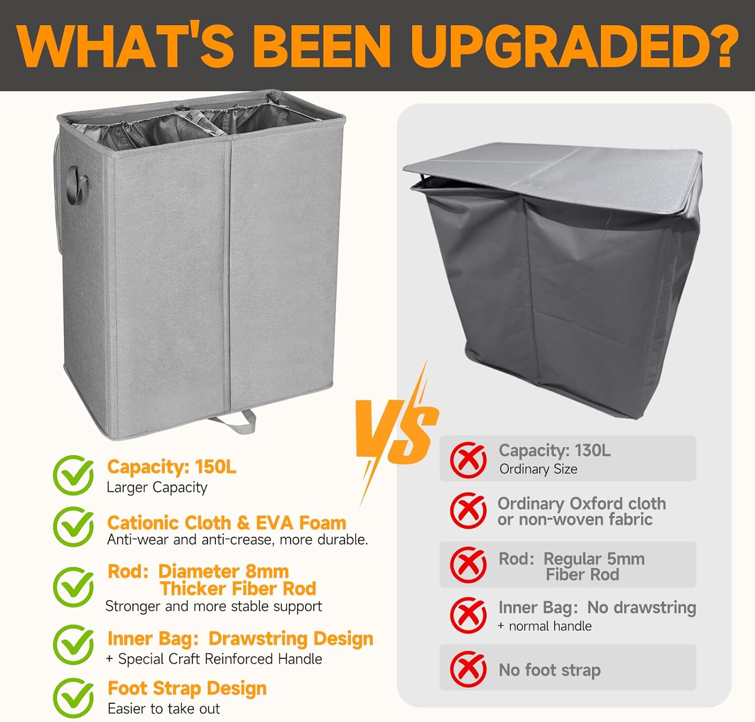- 【Size Upgrade】The double compartment clothes basket measures 24x 13.4 x 28in with a huge capacity of 150L, which can hold 4 loads of laundry, and each compartment is 75L which can hold 2 loads of laundry individually