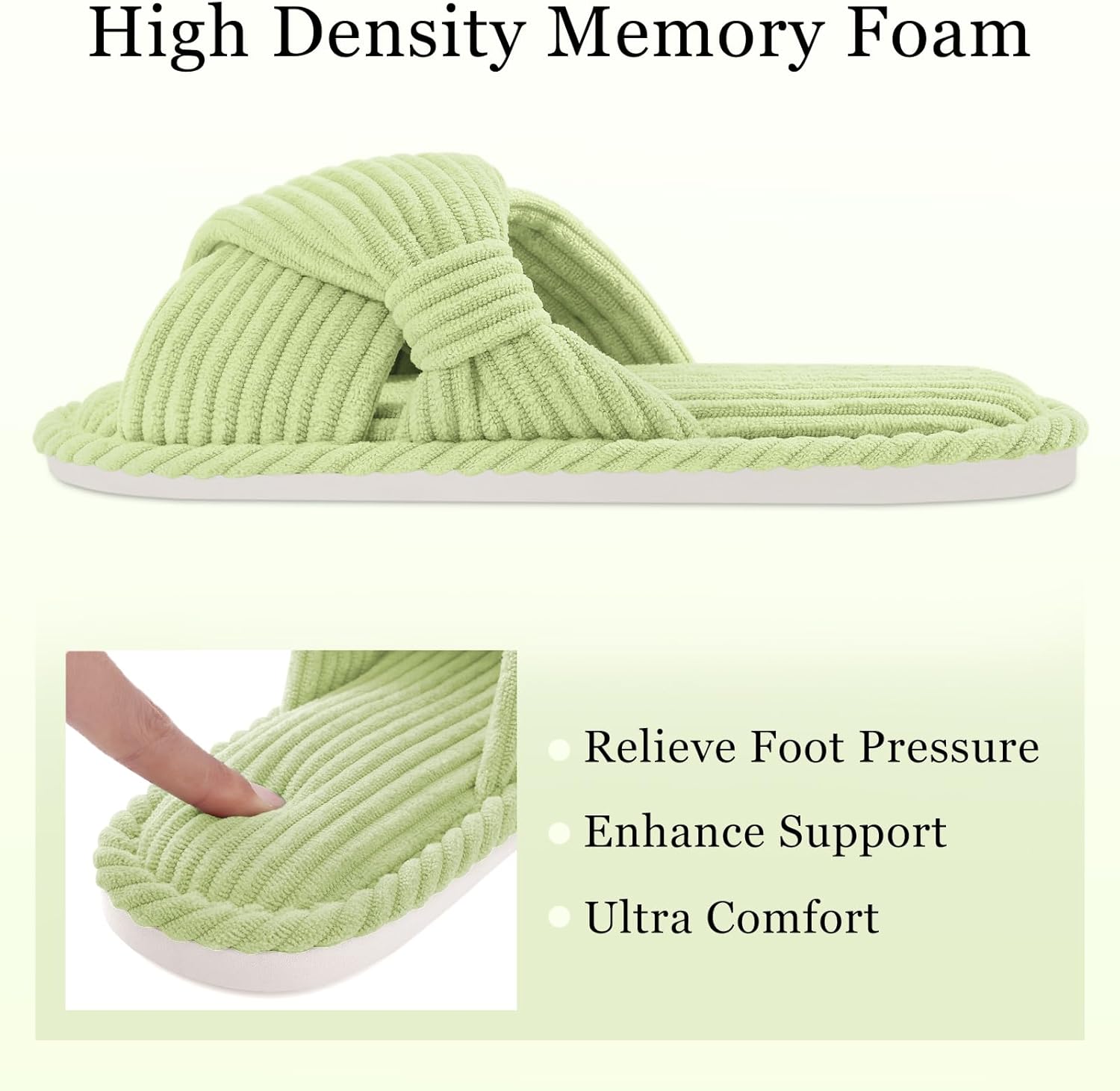Evshine Summer House Slippers for Women Corduroy Cross Bow Indoor Slippers Open Toe Slip On Bedroom Shoes with Memory Foam