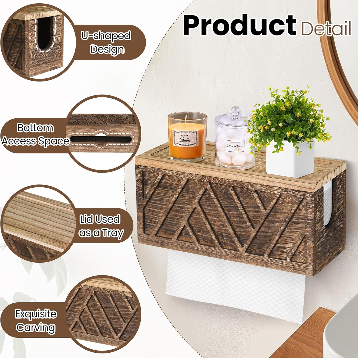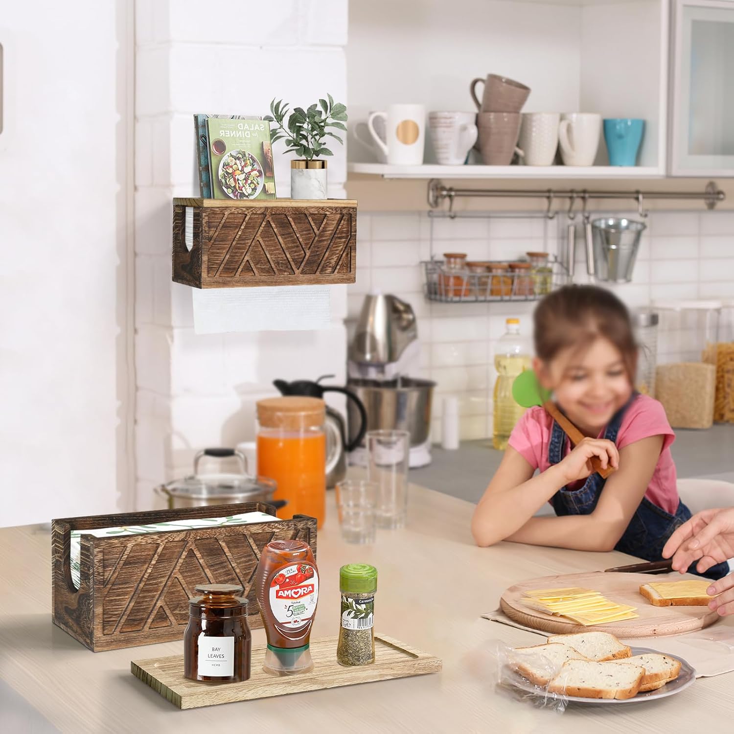 - ✨【Practical Paper Towel Holder for Farmhouse Decor】Our bathroom napkin dispenser is practical and beautiful. With wide and smooth opening bottom, our wall mount paper towel holder helps you easily access to the towel paper you need. In addition, the brown lid, exquisite carving, and dark brown appearance of the bathroom paper towel holder adds a rustic home decor to the room.Whether on display on your countertop, or hang on your home wall, the bathroom paper towel holder is an eye-catching focus.