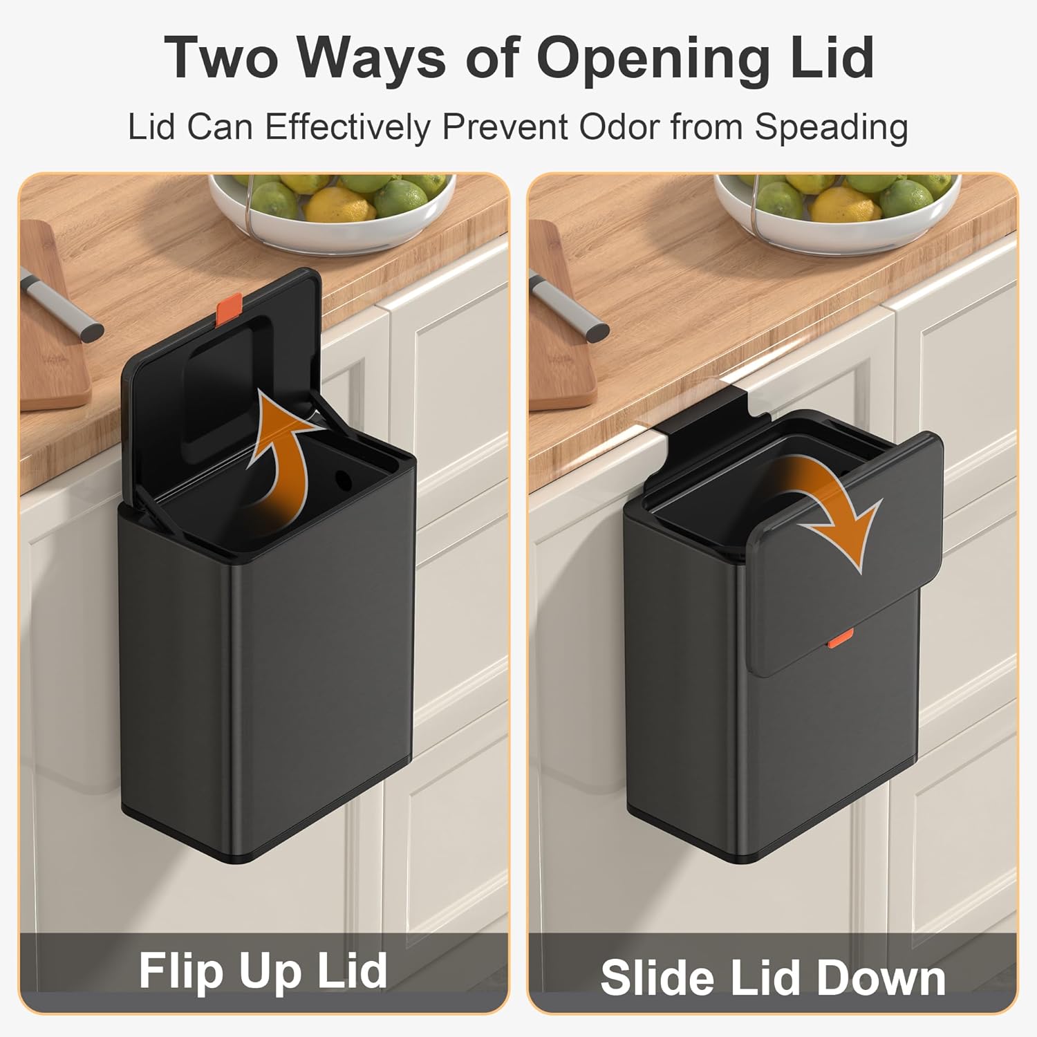 - 【WALL MOUNTED/COUNTERTOP/ UNDER SINK TRASH CAN】No need to bend over. The trash can provide Two opening and installation methods,Effortless and Fits for Most Cabinet Doors, Pantry Doors. The thickness of door should be less than 0.98" (2.5 cm). Small trash can can also be glued on kitchen or bathroom wall or under the sink