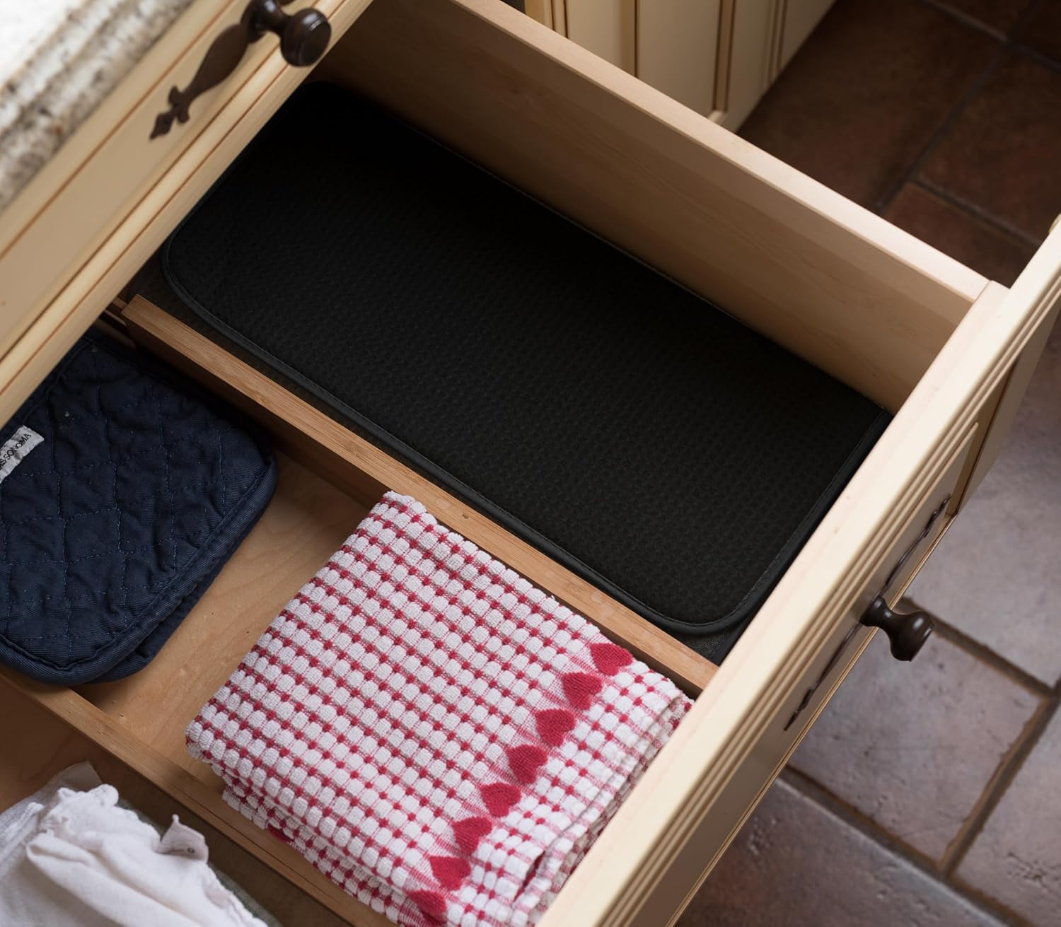 - THICKEST , STYLISH MAT | INNOVATIVE HONEYCOMB WEAVE: Keep your counter spotless even while washing a sink full of kitchen dishes . Our superbly stylish drying mat is among the thickest on the market today , and its innovative honeycomb microfiber structure enhances absorption and quickens drying time . Idea kitchen accessories for countertop