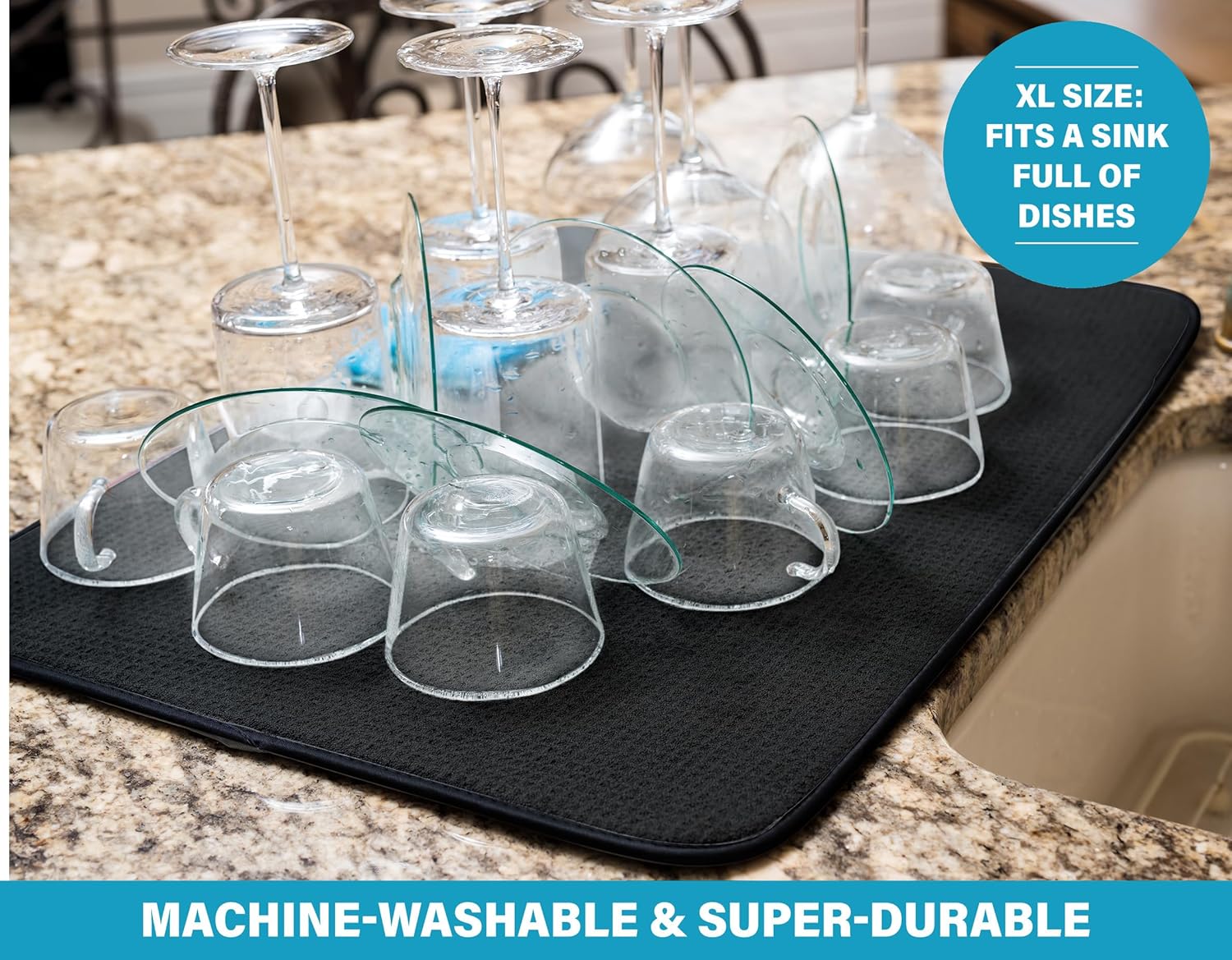 - KEEP YOUR ANTIQUE GLASSWARE SAFE: Our stylish kitchen drying mat protects your counter from scuffs and scratches while also keeping your most prized kitchen essentials and glassware safe and sound . And If you ever feel like washing your dish drying mat , simply toss it in the wash with the rest of your laundry-this absorbent microfiber construction has a flexible core that does not weaken in the wash