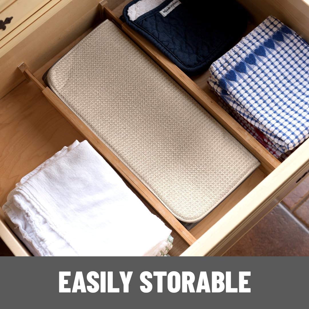 - THICKEST , STYLISH MAT | INNOVATIVE HONEYCOMB WEAVE: Keep your counter spotless even while washing a sink full of kitchen dishes . Our superbly stylish drying mat is among the thickest on the market today , and its innovative honeycomb microfiber structure enhances absorption and quickens drying time . Idea kitchen accessories for countertop