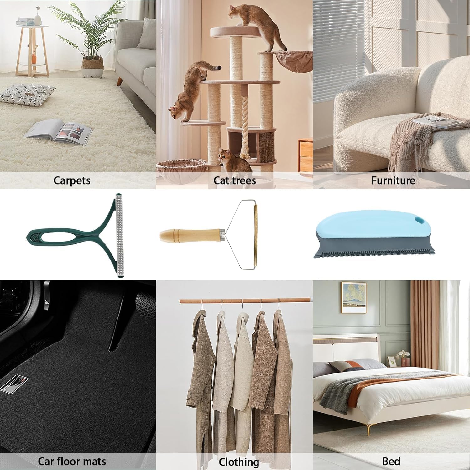 - 【THREE SHAPES FOR DIFFERENT SCENARIOS】pet hair remover 5-piece set contains three different shapes, all ergonomic, comfortable and convenient to hold. The plastic handle can be used in carpets, sofas, cat trees, all kinds of furniture and other heavy items; the wooden handle is suitable for lighter and softer materials: such as bed sheets, light clothes, etc. The blue handle of the pet hair remover contains a double row of combs, which can clean the hair with less effort.