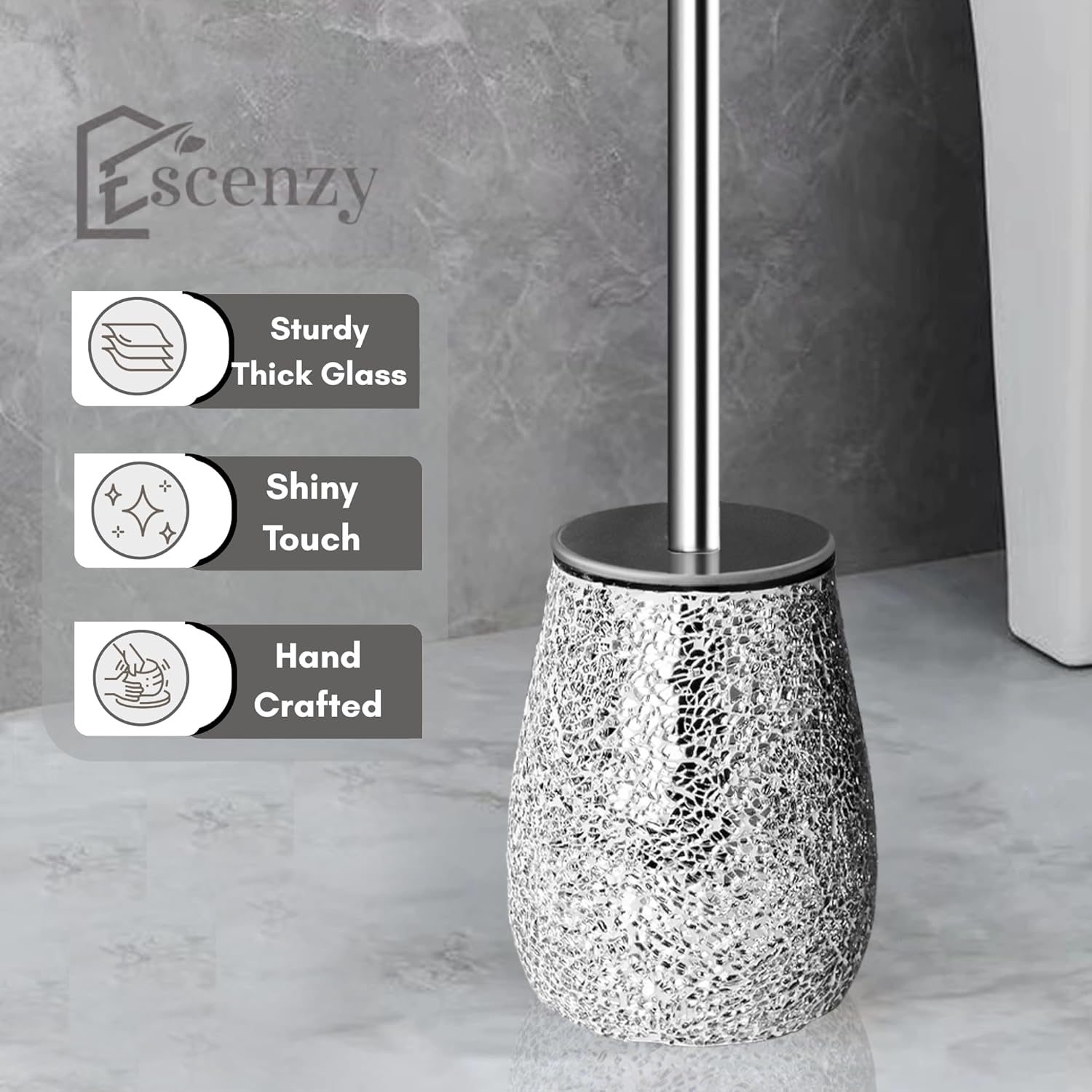 Escenzy Modern Toilet Brush and Holder Set Mosaic Glass | Non-Rustic Stainless Steel | Practical & Decorative Toilet Bowl Brush and Holder | Luxury Silver Glitter Bathroom Accessories