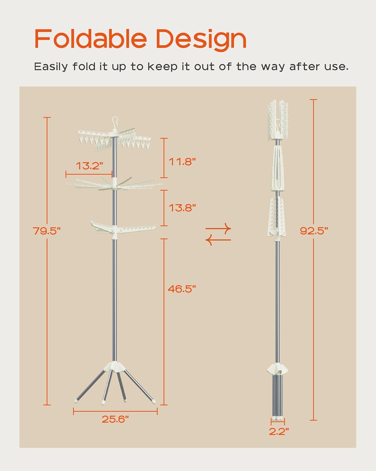 - [Foldable and Space-Saving] This vertical drying rack measures 25.6”D x 25.6”W x 79.5”H and takes up very little space. After use, simply fold the four legs and three drying rods into a smaller size: 2.2 "D x 2.2 "W x 92.5"H, which can be leaned against the footrest, perfect for apartment laundry rooms or narrow spaces and corners.