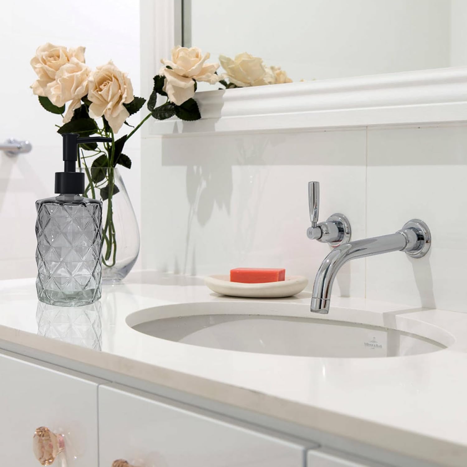 - Gradient Grey Glass Soap Dispenser with Black Pump: Our grey glass soap dispenser is made of high-quality lead-free glass, naturally and safely filled with various indoor liquids for daily use. Glass lotion bottle is reusable, refillable, environmentally friendly, and recyclable.
