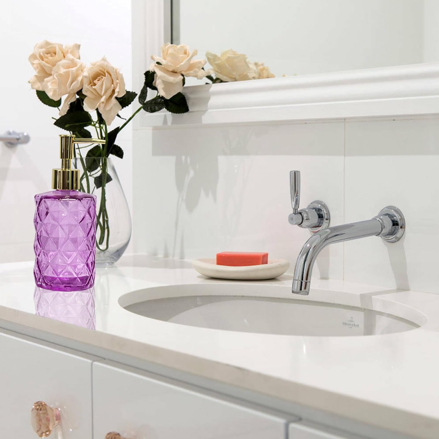 Glass Soap Dispenser with Gold Plastic Pump, 12oz Refillable Liquid Hand Soap Dispenser, Crystal Lotion Bottle for Modern Home Decor, Bathroom, Kitchen Countertop, Hotel(Rosy)