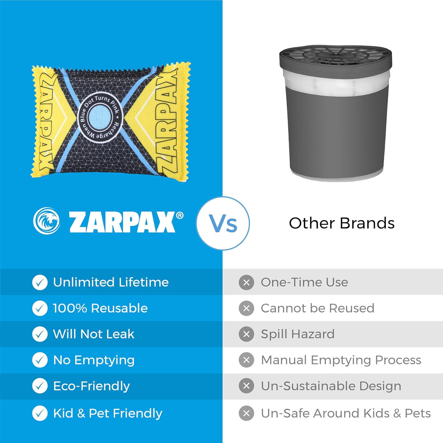 - 100% LEAK PROOF: For a completely moisture-free, damp-free car or home, select ZARPAX's humidity absorber. Our reusable dehumidifier contains silica that seamlessly eliminates condensation and moisture from the air creating and maintaining an incredibly fresh environment! The moisture absorber is 100% leak proof meaning you will never have to contend with leaks, only a fresh environment.