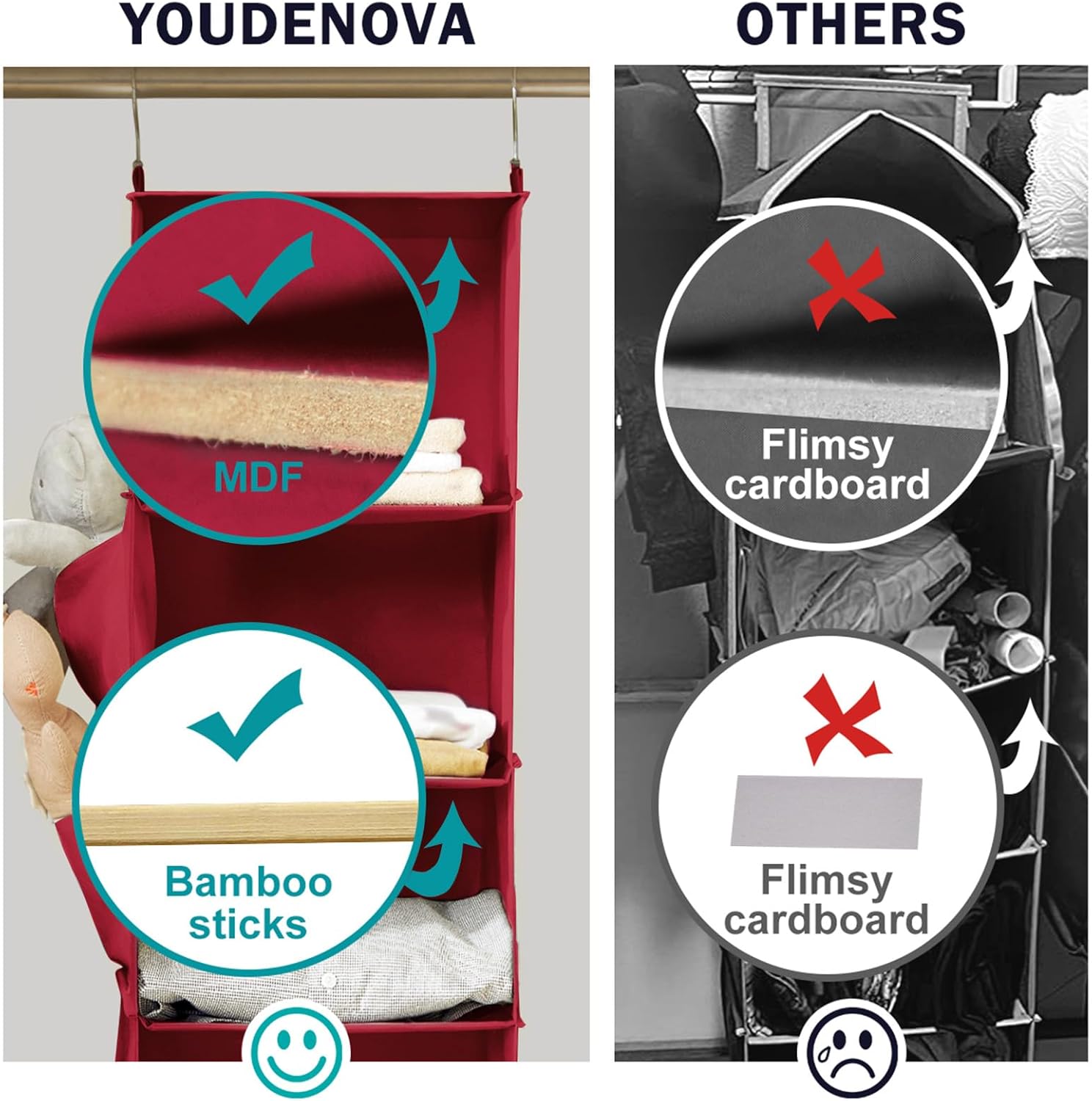 YOUDENOVA Hanging Closet Organizer and Storage, 6-Shelf Closet Hanging Storage Shelves, Dark Red